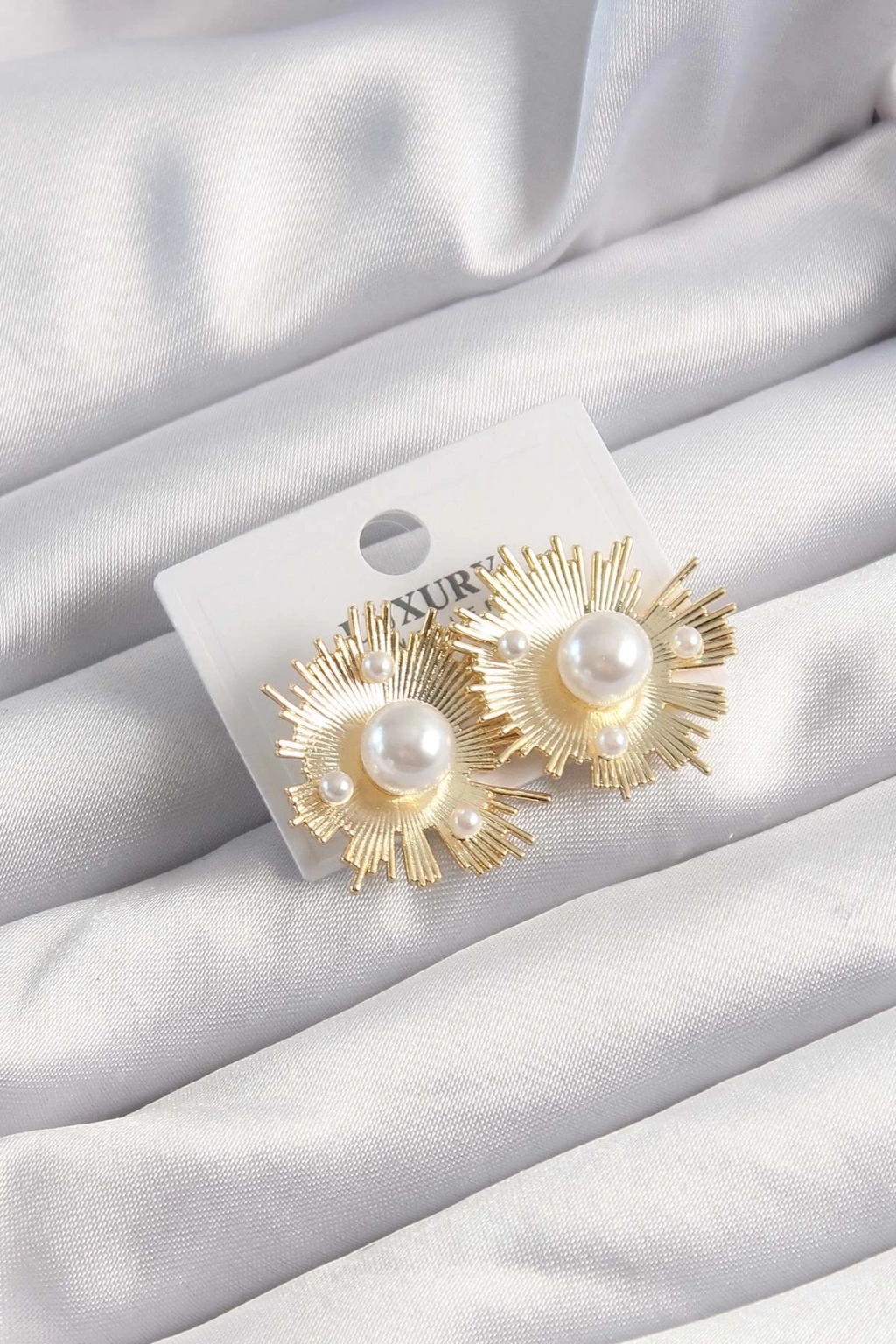 BFS Pirinç Gold Renk Zirkon Taşlı Parlayan İnci Taneleri Küpe