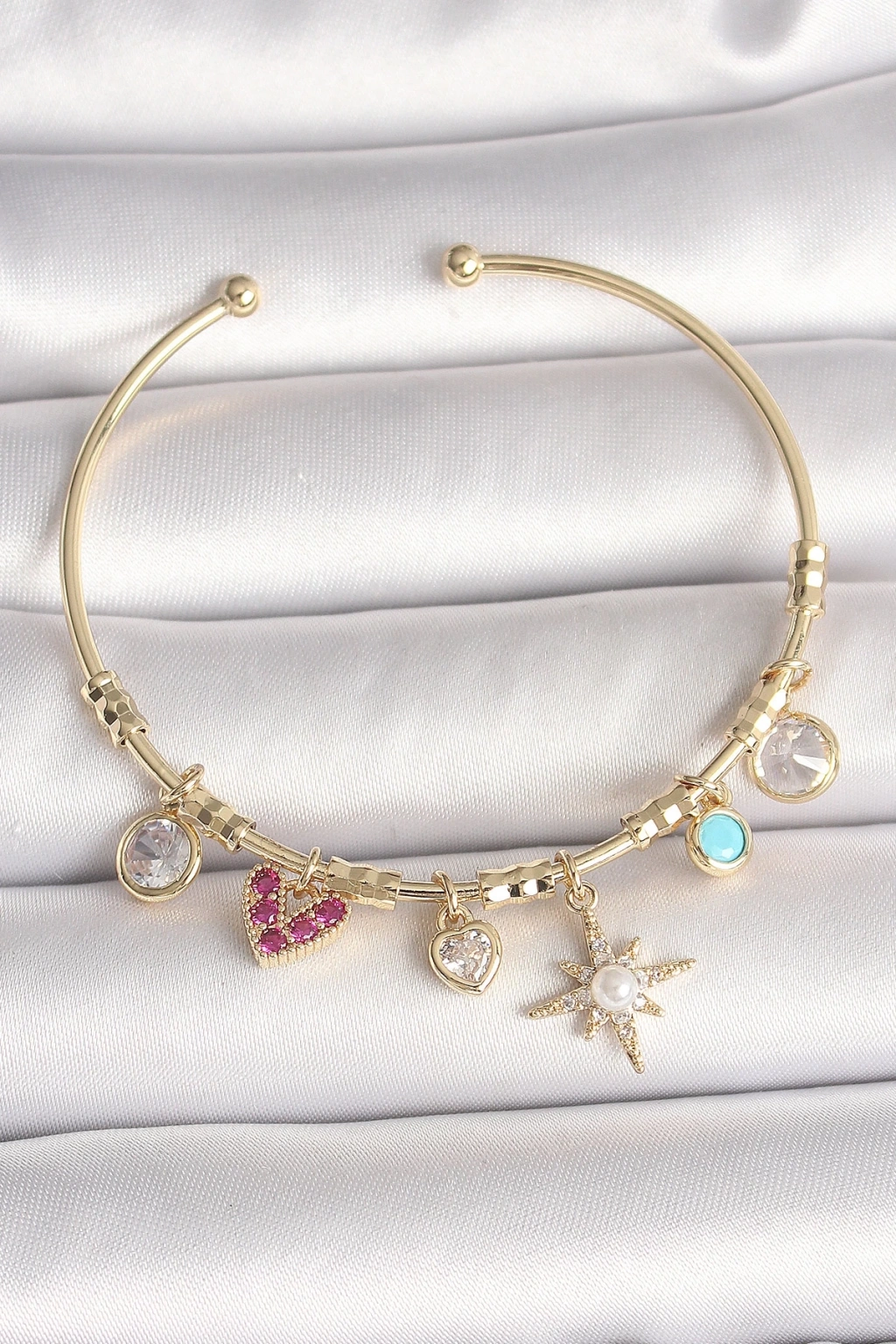 BFS Pirinç Gold Renk Zirkon Taşlı Sallantı Kutup Yıldız Figür İnci Detay Charm Kadın Bileklik