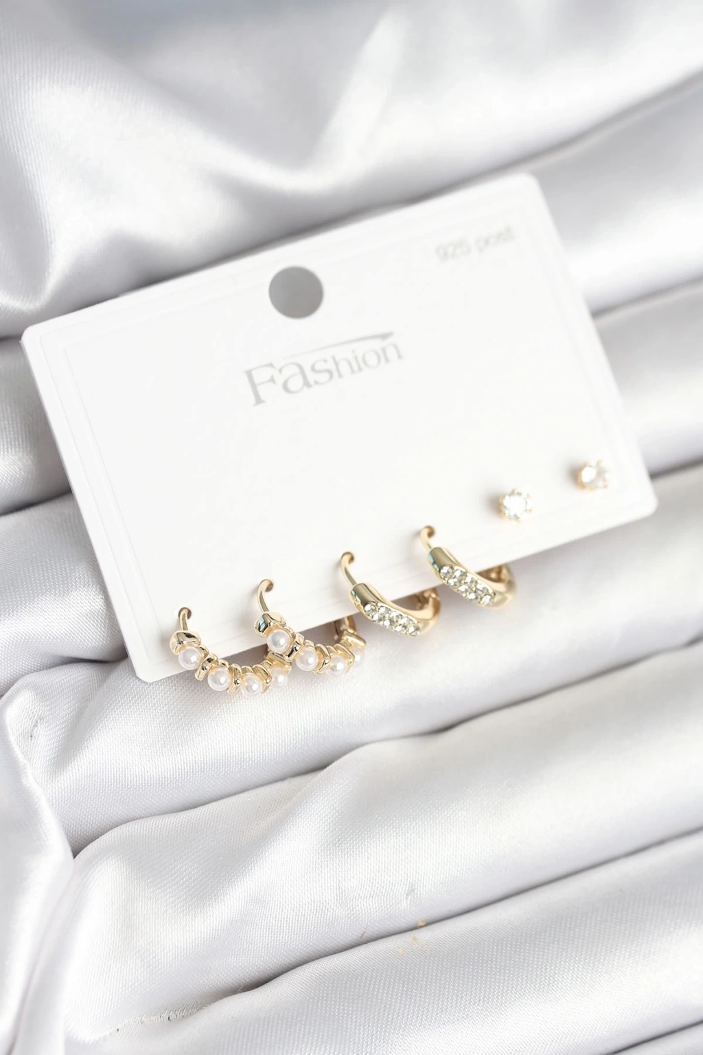 BFS Pirinç Gold Renk Zirkon Taşlı ve İncili Model 925 Ayar Gümüş Çivi Kadın Küpe Seti