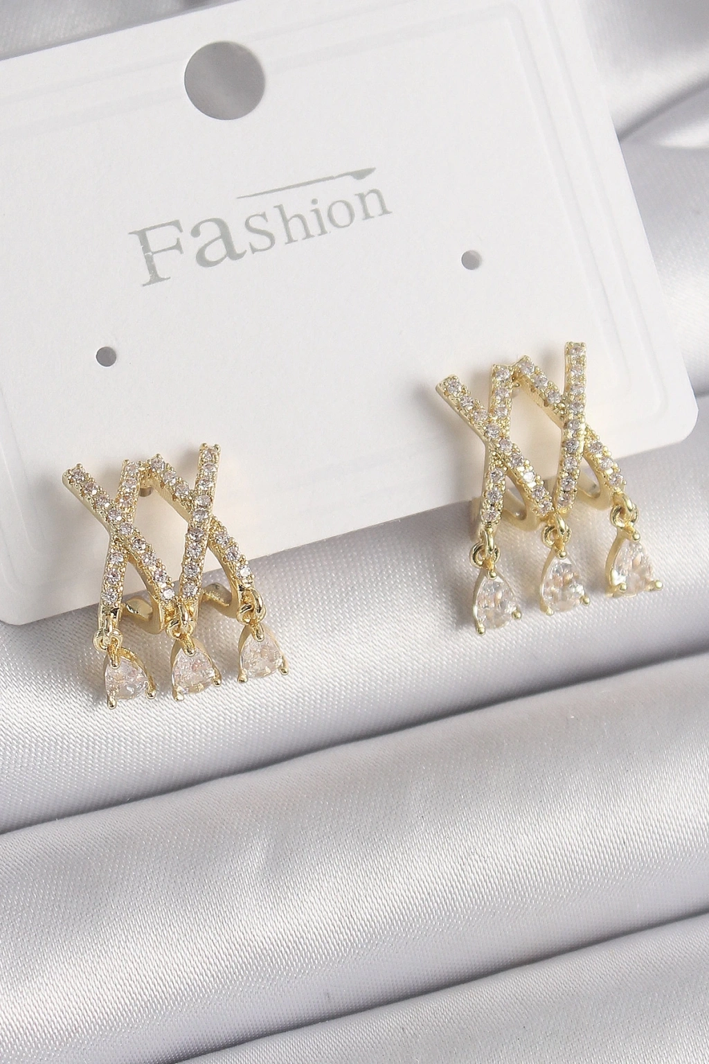 BFS Pirinç Gold Renk Zirkon Taşlı X Model Sallantı Detay Kadın Küpe