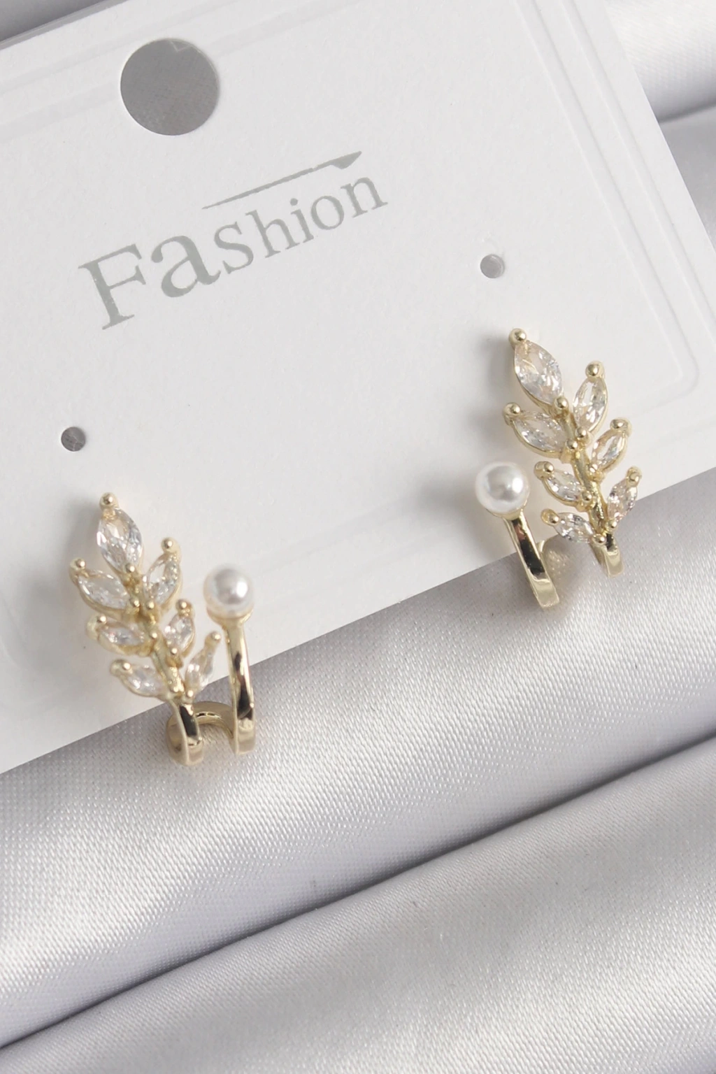 BFS Pirinç Gold Renk Zirkon Taşlı Yaprak Model İnci Detay Küpe
