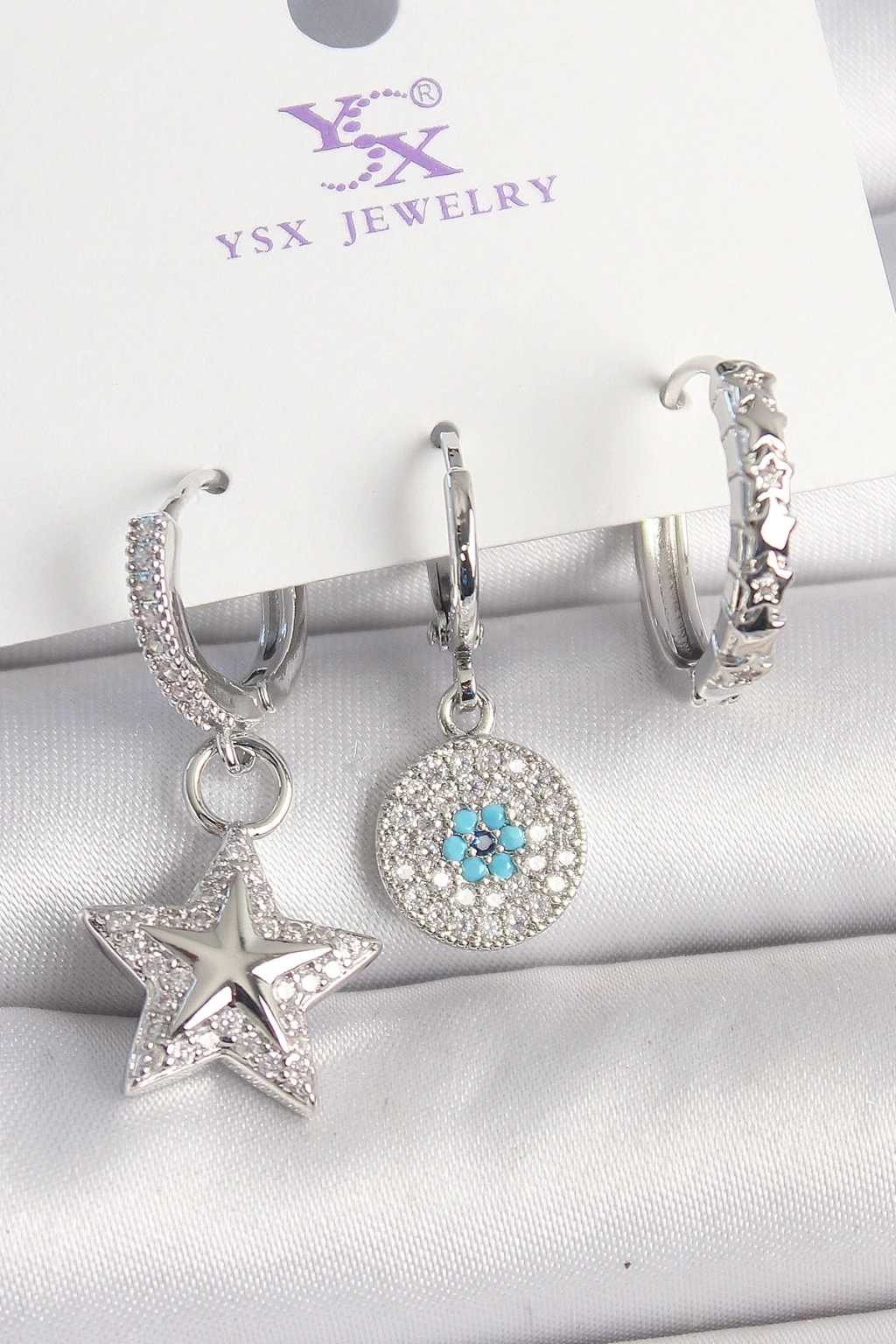 BFS Pirinç Gold Renk Zirkon Taşlı Yıldız Model Nazar Boncuk Detay 3'Lü Kadın Kombin Küpe