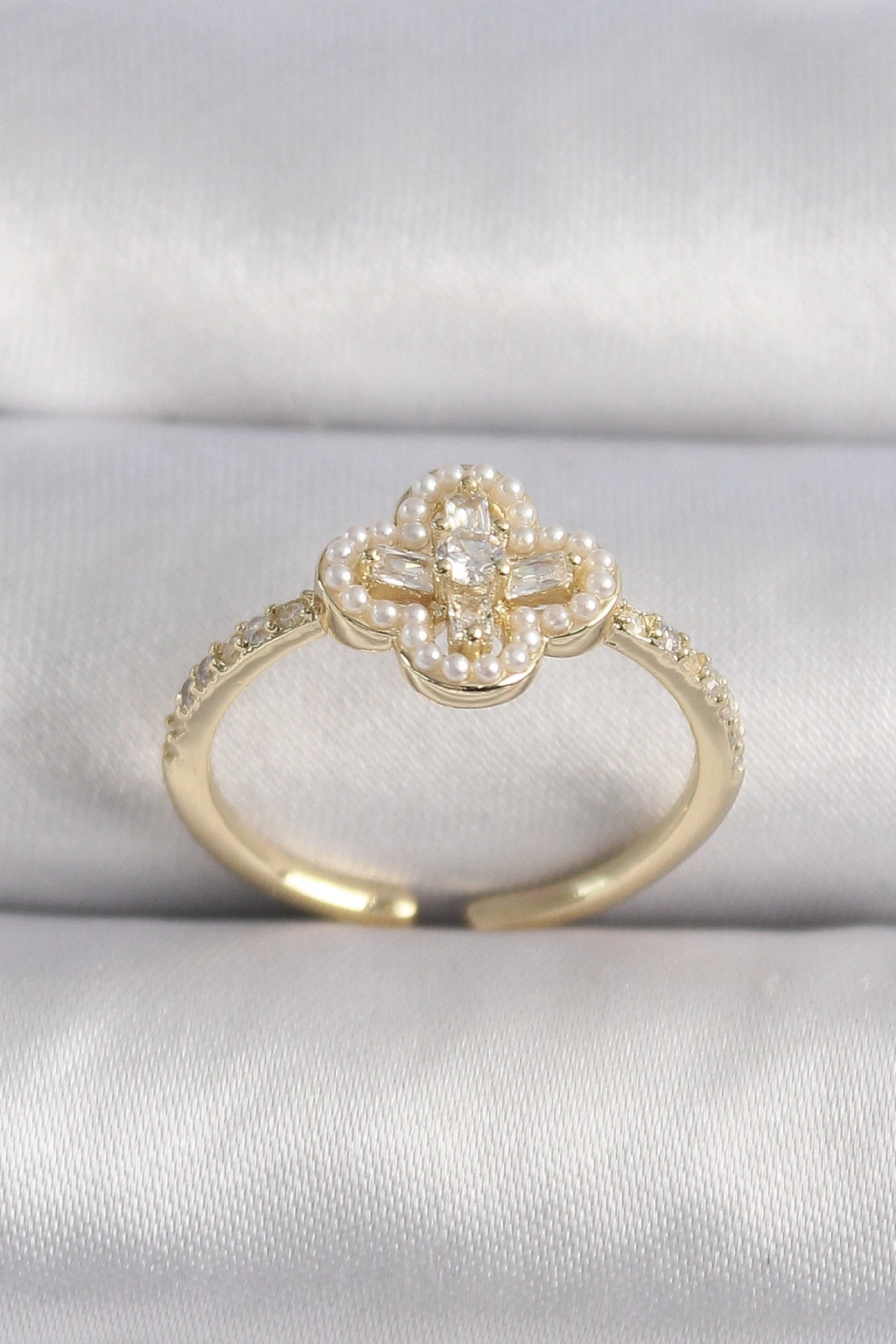 BFS Pirinç Gold Renk Zirkon Taşlı Yonca Model İnci Detay Kadın Yüzük