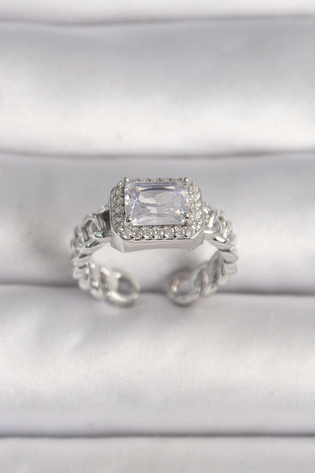 BFS Pirinç Gümüş Renk Ayarlanabilir Zincir Kare Zirkon Taşlı Kadın Yüzük