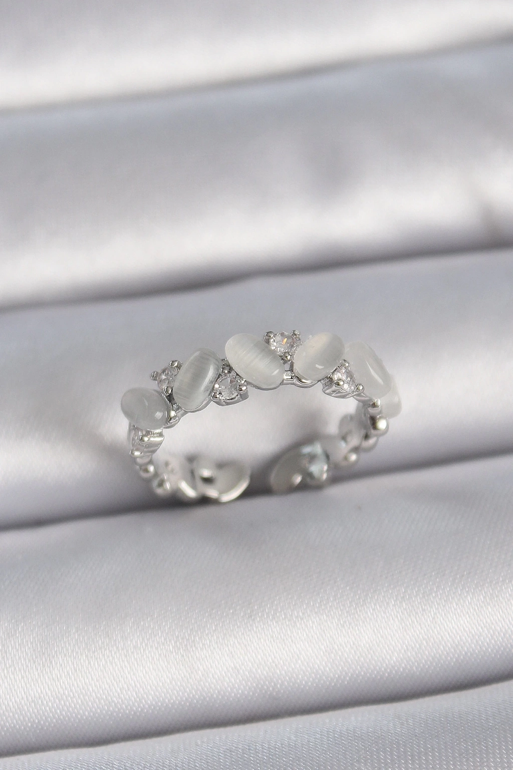 BFS Pirinç Gümüş Renk Ayarlanabilir Zirkon Taşlı Beyaz Mineli Model Kadın Yüzük