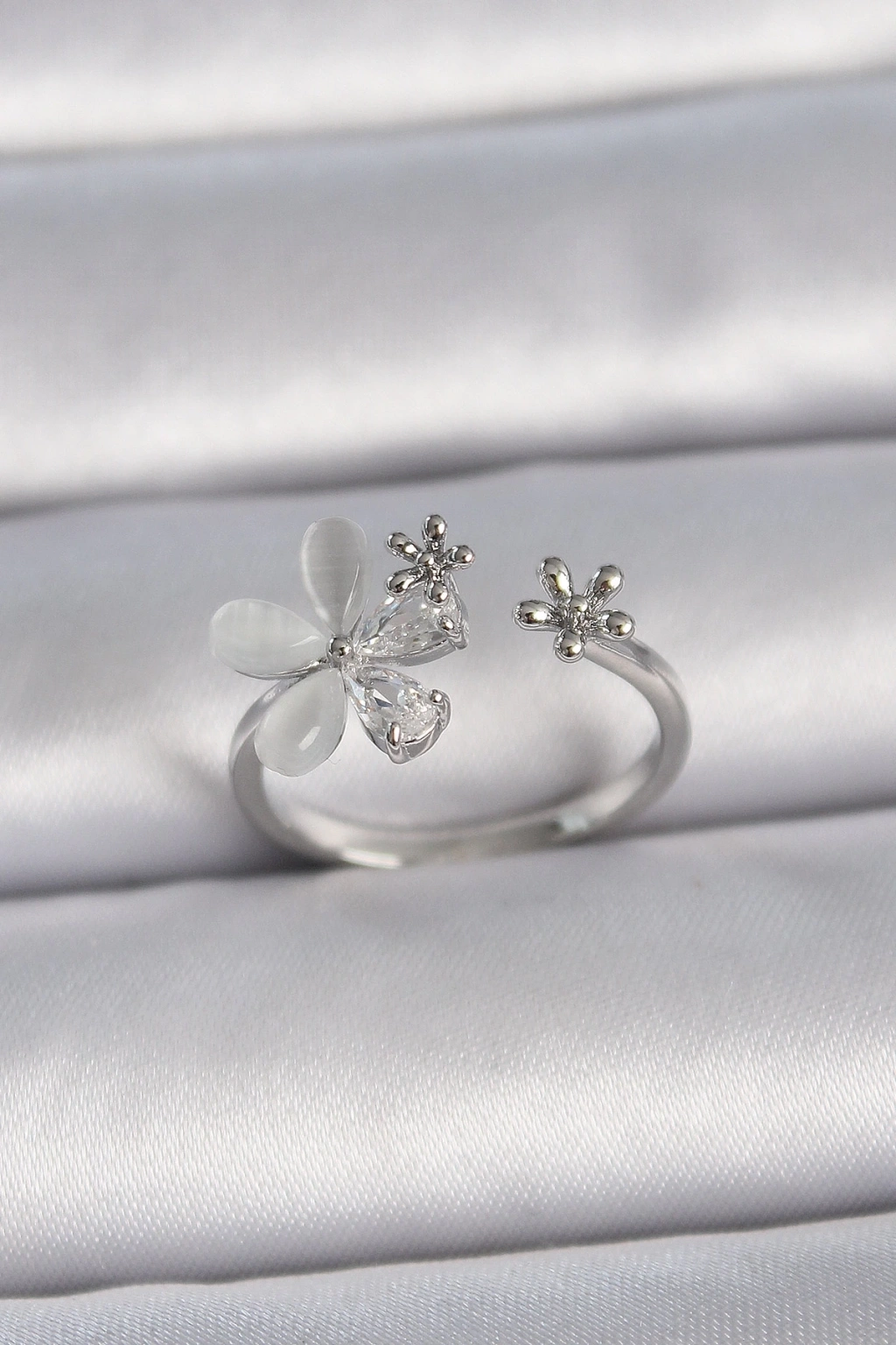 BFS Pirinç Gümüş Renk Ayarlanabilir Zirkon Taşlı Beyaz Mineli Yaprak Model Kadın Yüzük