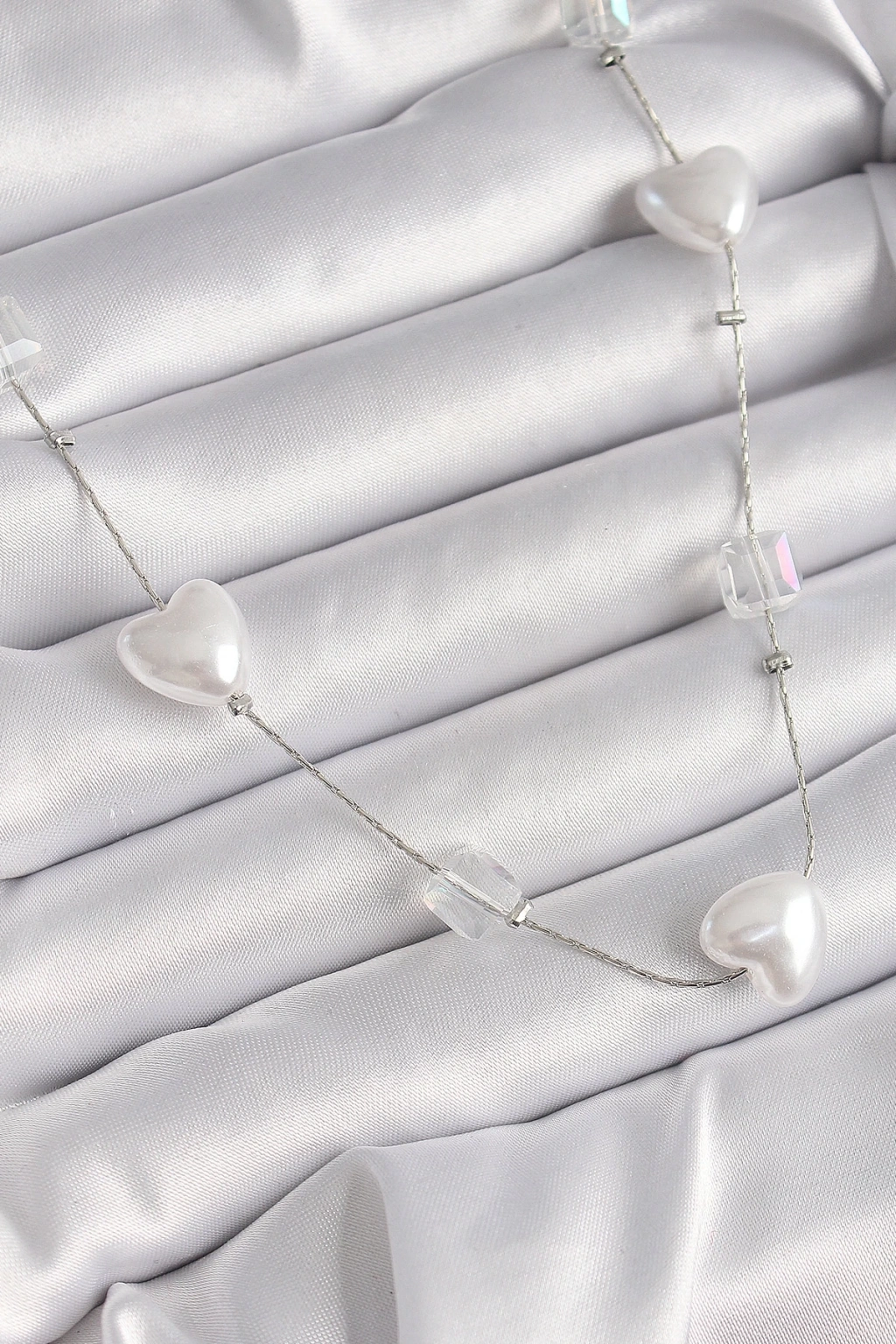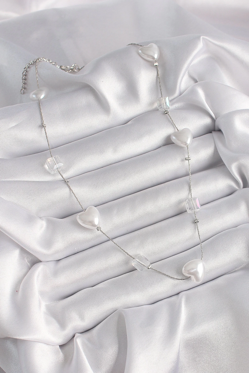 BFS Pirinç Gümüş Renk Beyaz İnci Kalp Model Kadın Kolye