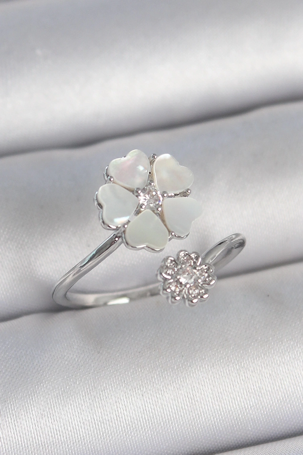 BFS Pirinç Gümüş Renk Beyaz Mineli Çiçek Model Zirkon Taş Detay Kadın Yüzük