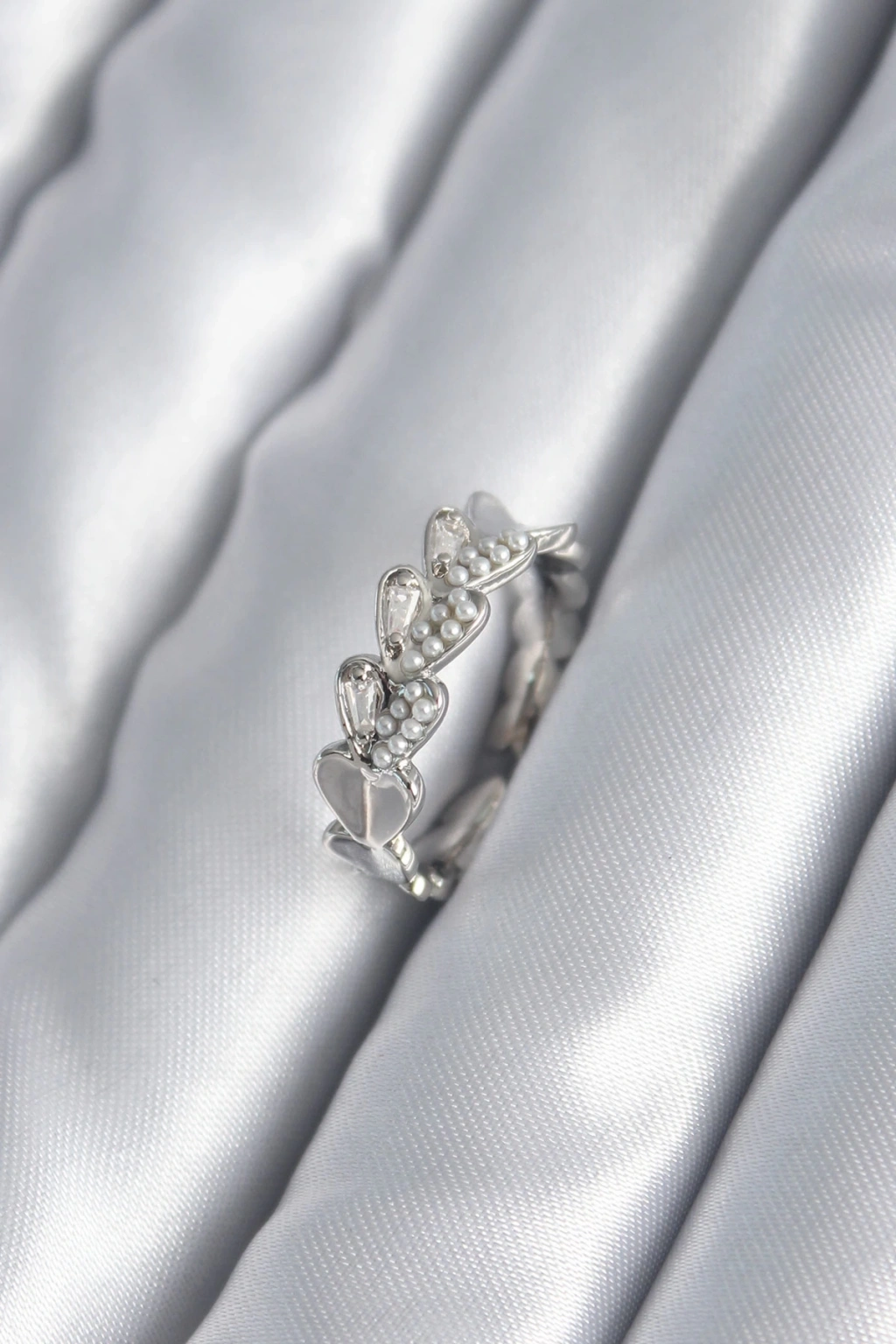BFS Pirinç Gümüş Renk Kalp Model İnci Detay Kadın Yüzük