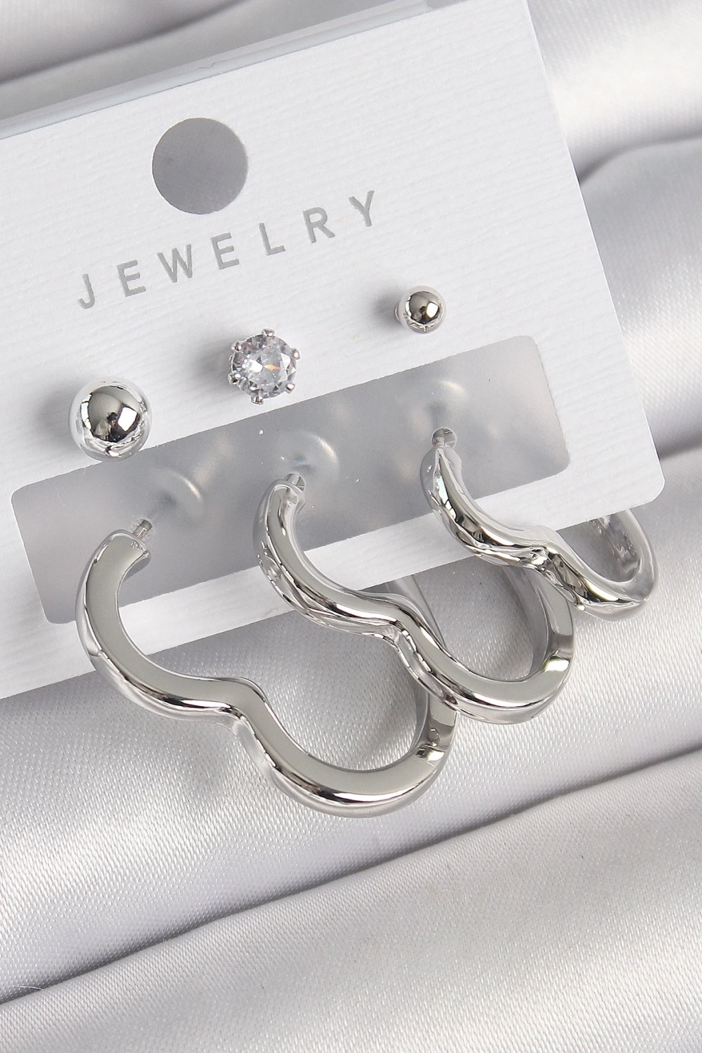 BFS Pirinç Gümüş Renk Kalp Model Zirkon Taş Topçuk Detay Kadın Küpe Seti