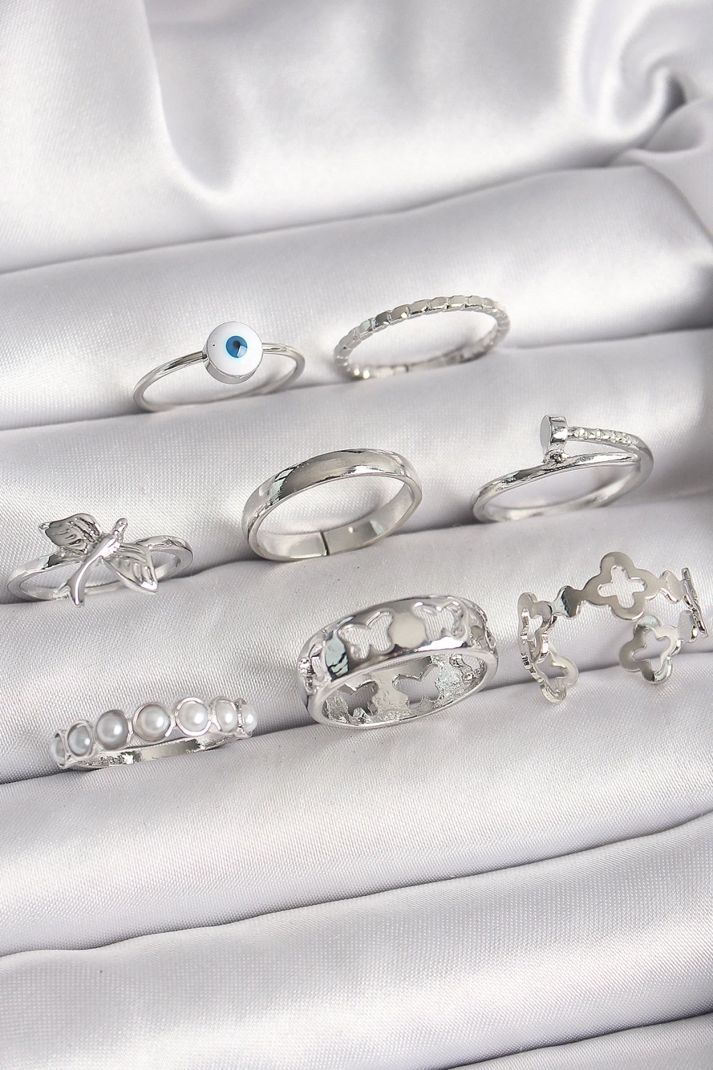 BFS Pirinç Gümüş Renk Nazar Boncuk Detay İncili Kelebek İşlemeli Kadın Yüzük Kombini