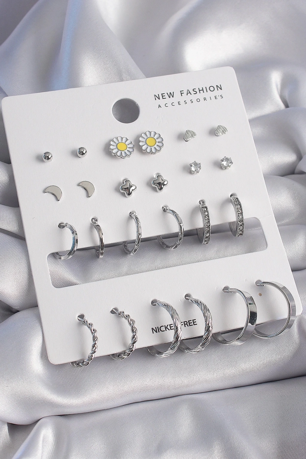 BFS Pirinç Gümüş Renk Papatya Detaylı 12 Çiftli Kadın Küpe Seti