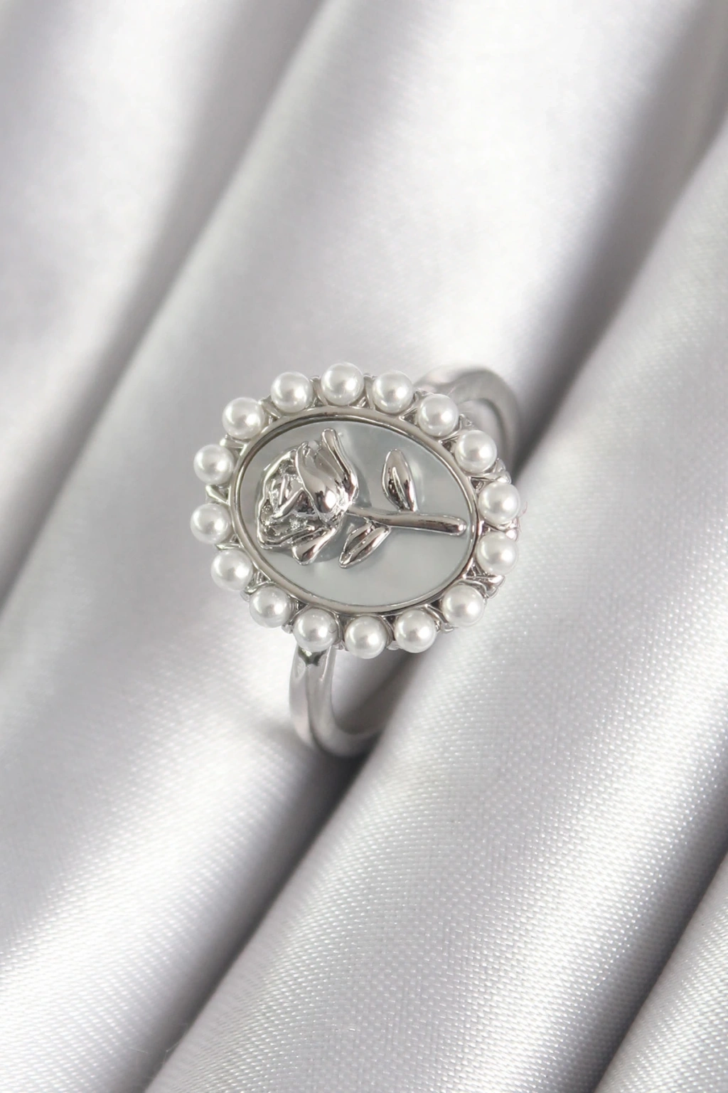 BFS Pirinç Gümüş Renk Portre Gül Model İnci Detay Kadın Yüzük