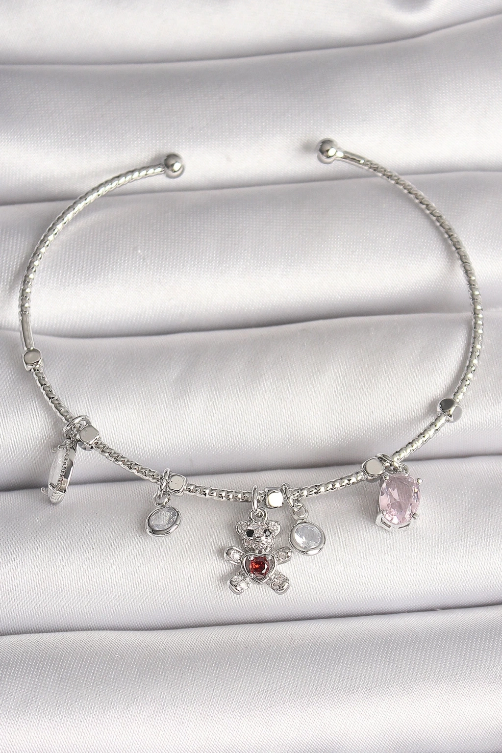 BFS Pirinç Gümüş Renk Sallantı Zirkon Taşlı Ayıcık Figür Kırmızı Taş Detay Charm Kadın Bileklik