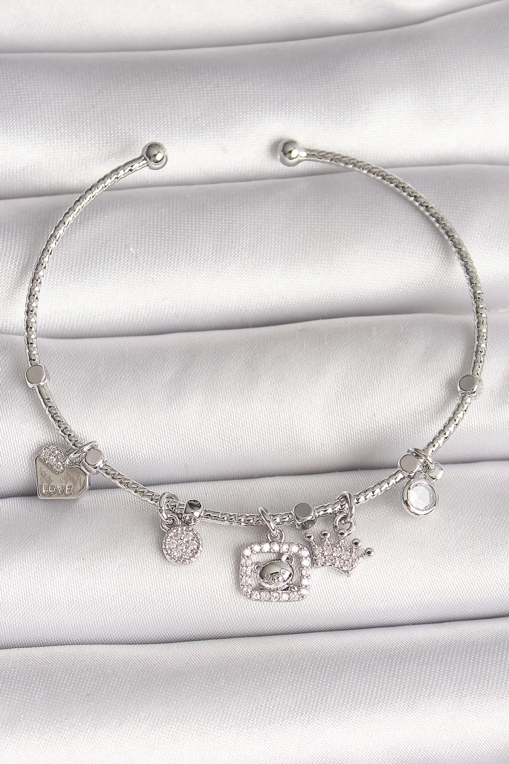 BFS Pirinç Gümüş Renk Sallantı Zirkon Taşlı Ayıcık Figür Taç Detay Charm Kadın Bileklik