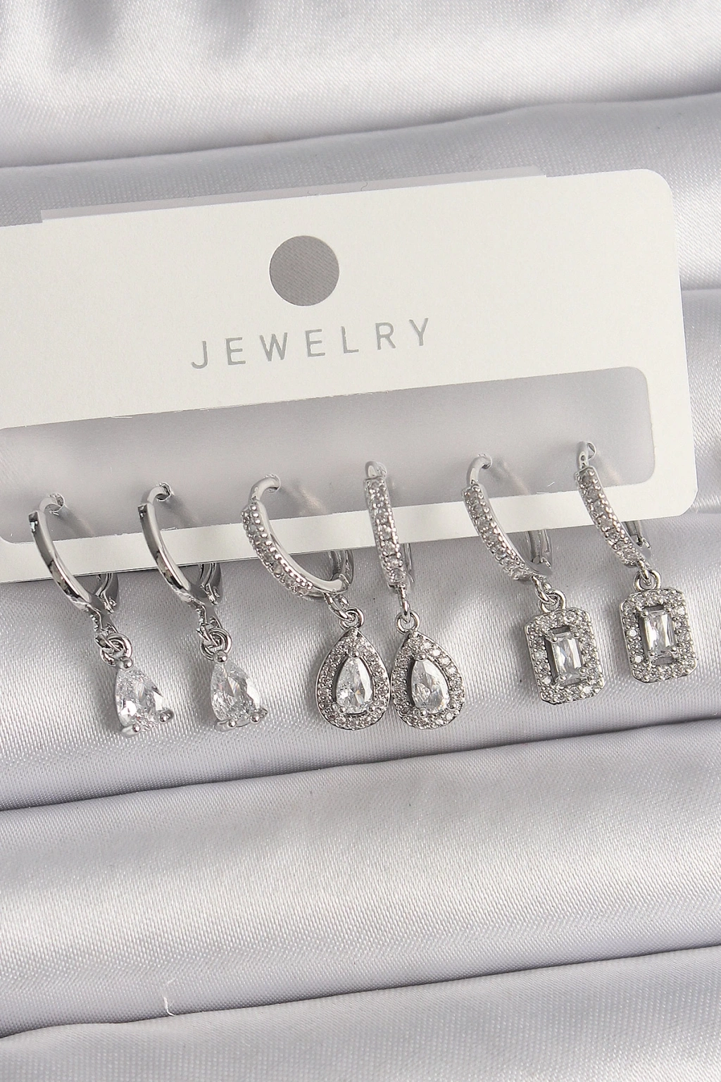 BFS Pirinç Gümüş Renk Sallantı Zirkon Taşlı Damla Model Kadın Küpe Seti