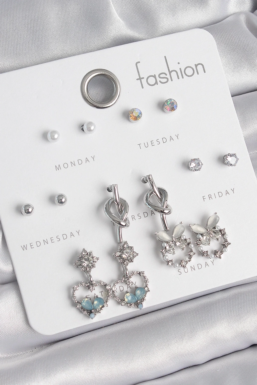 BFS Pirinç Gümüş Renk Sallantı Zirkon Taşlı Kalp Model Düğüm Detay 7 Çift Kadın Küpe Seti