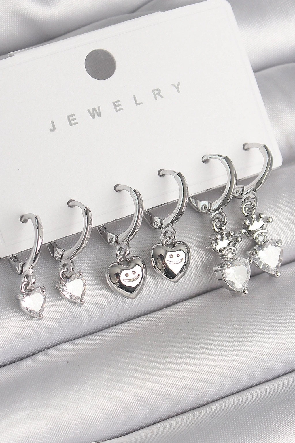 BFS Pirinç Gümüş Renk Sallantı Zirkon Taşlı Kalp Model Taç Detay Kadın Küpe Seti