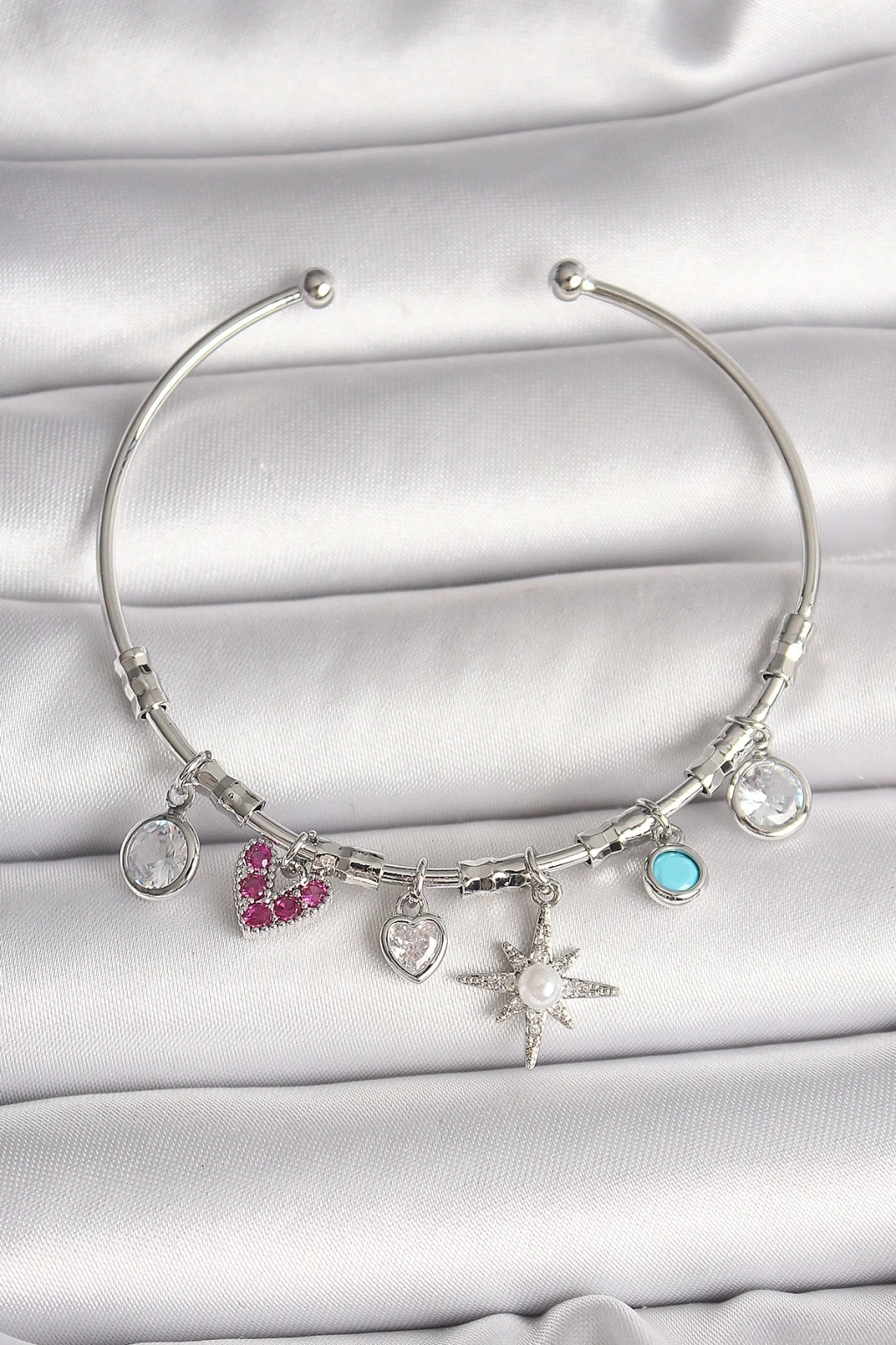 BFS Pirinç Gümüş Renk Sallantı Zirkon Taşlı Kutup Yıldız Figür Kalp Detay Charm Kadın Bileklik