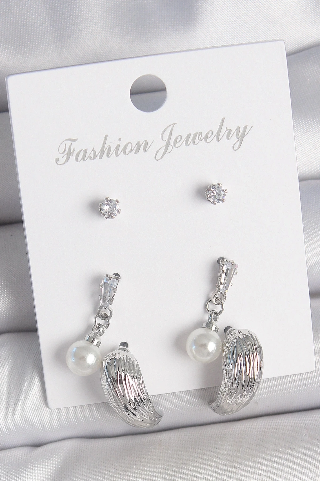 BFS Pirinç Gümüş Renk Sallantılı Zirkon Taşlı Damla Model 3 Çift Kadın Küpe Seti