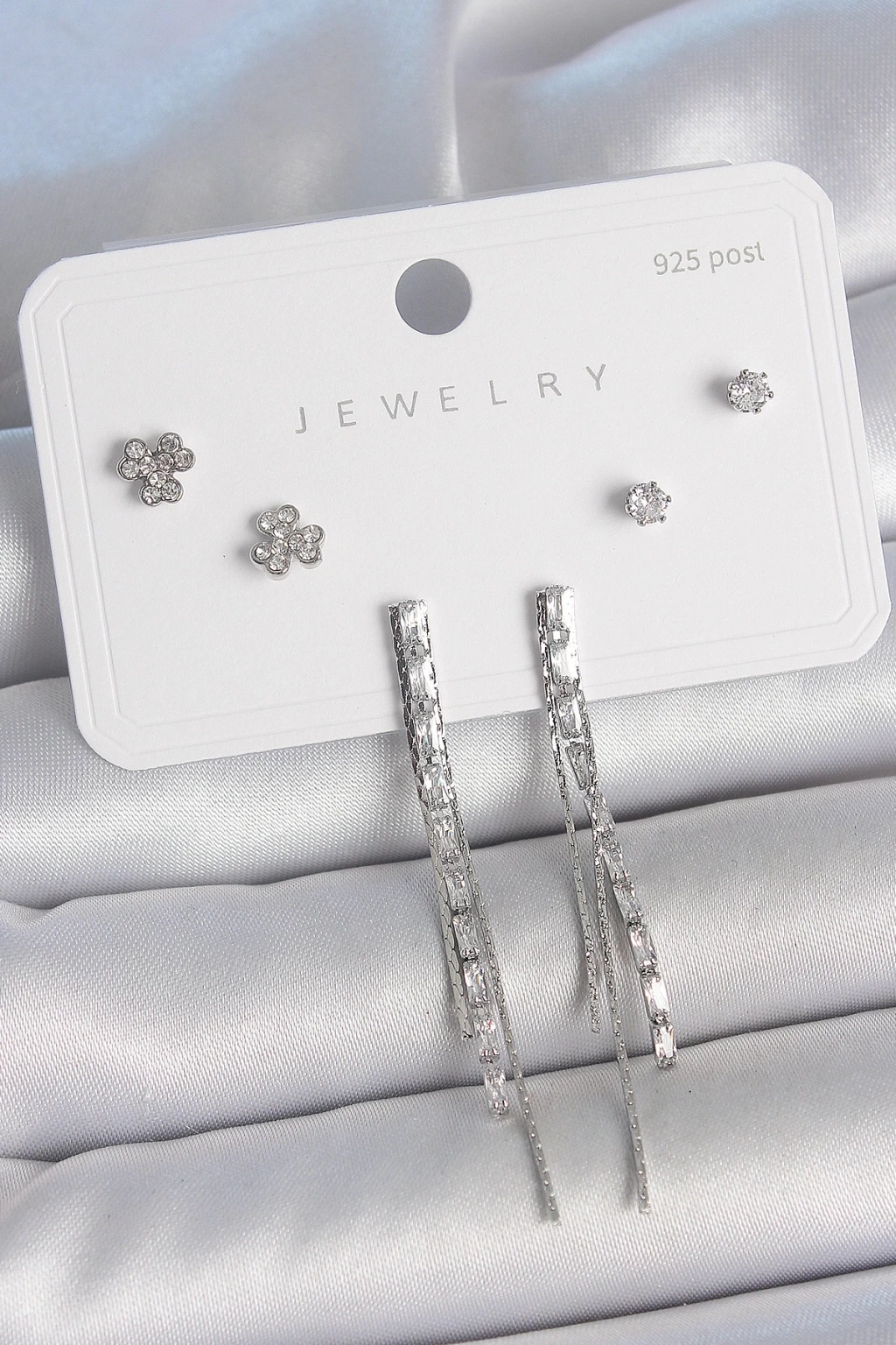 BFS Pirinç Gümüş Renk Su Yolu Zirkon Taşlı Sallantı Model Çiçek Detay 925 Ayar Gümüş Çivi Kadın Küpe Seti