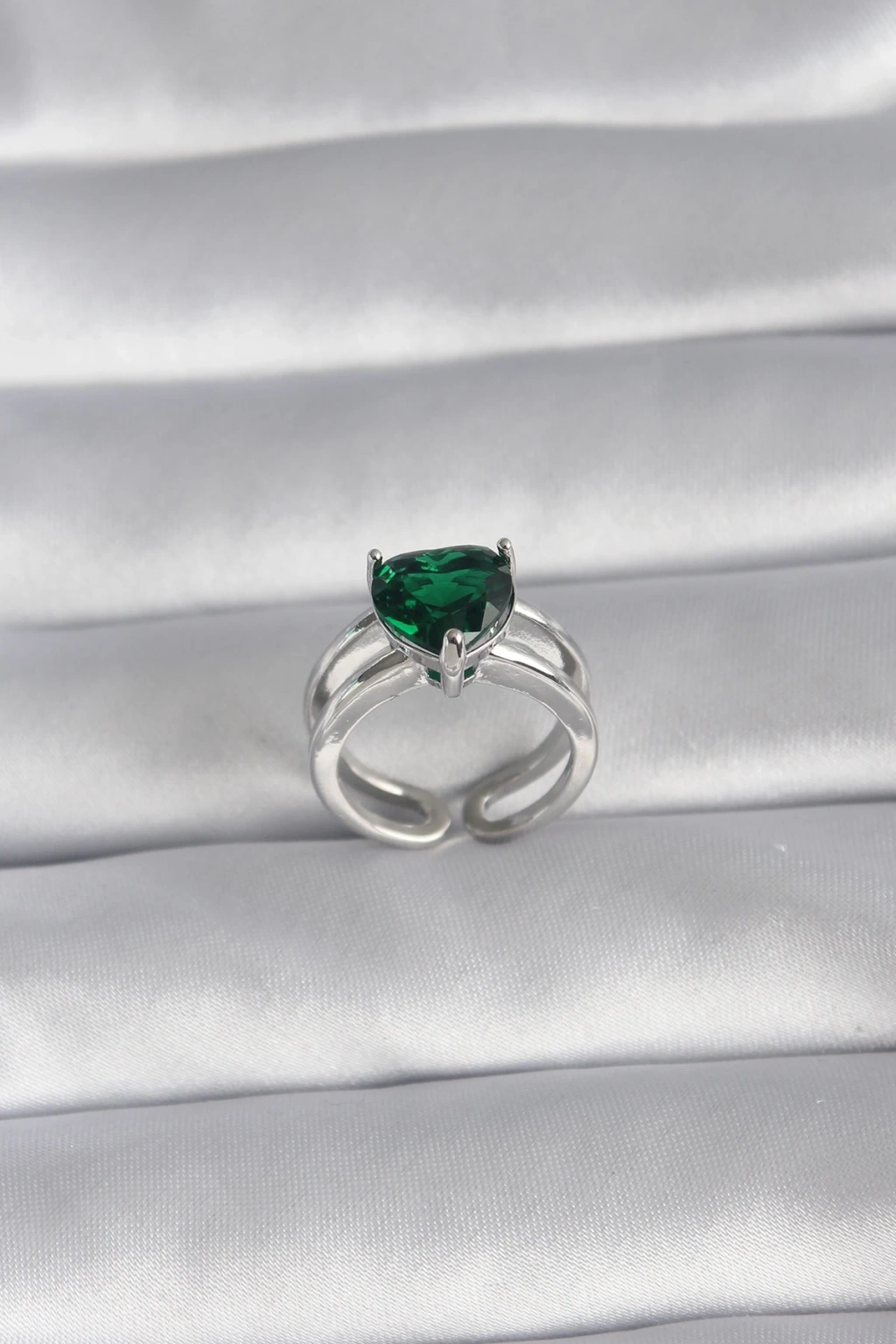 BFS Pirinç Gümüş Renk Yeşil Zirkon Taşlı Tek Taş Model Kadın Yüzük