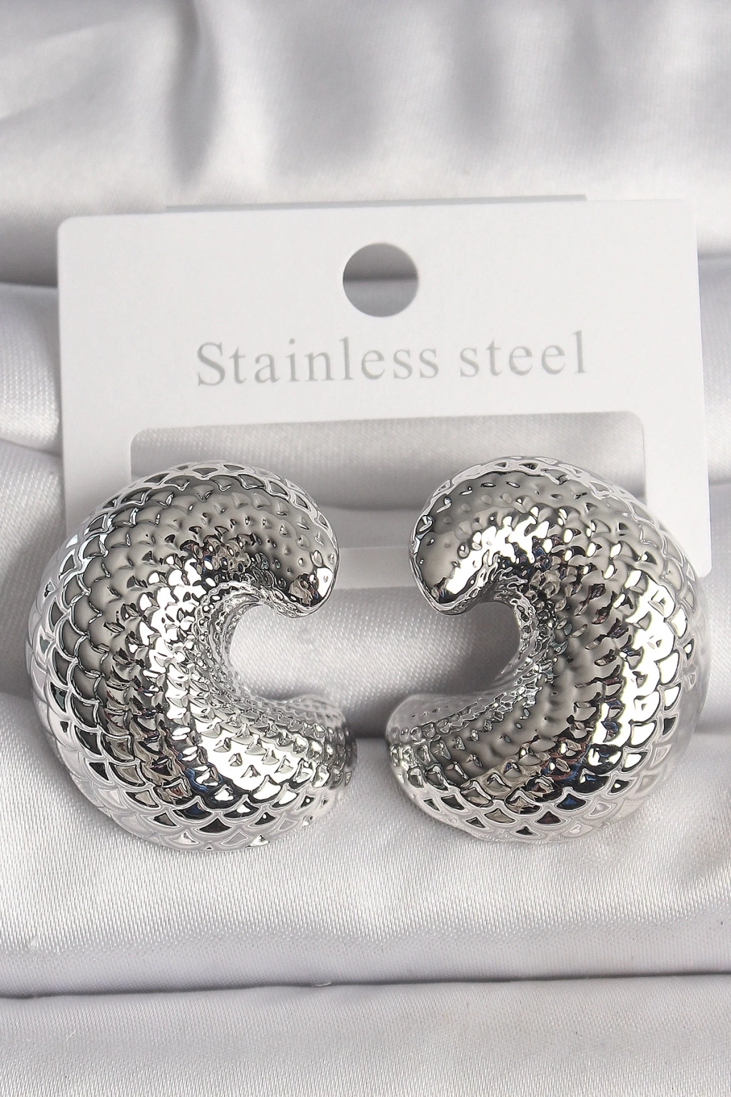 BFS Pirinç Gümüş Renk Yılan Sırtı İşlemeli Yarım Halka Model Kadın Küpe