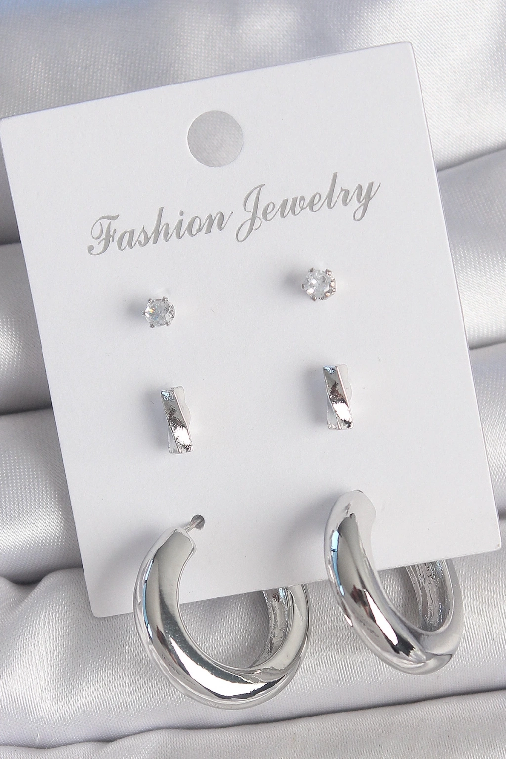 BFS Pirinç Gümüş Renk Zirkon Taş Detay Halka Model 3 Çift Kadın Küpe Seti