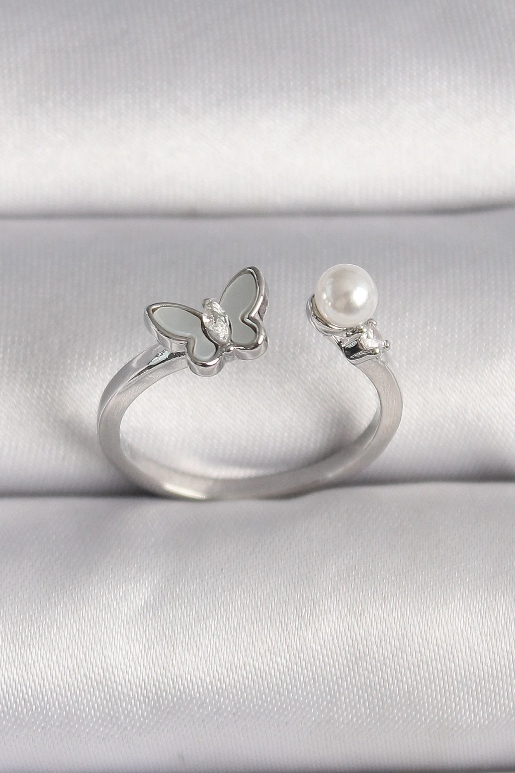 BFS Pirinç Gümüş Renk Zirkon Taş Detaylı Beyaz Mineli Kelebek Figür İnci Detay Ayarlanabilir Yüzük