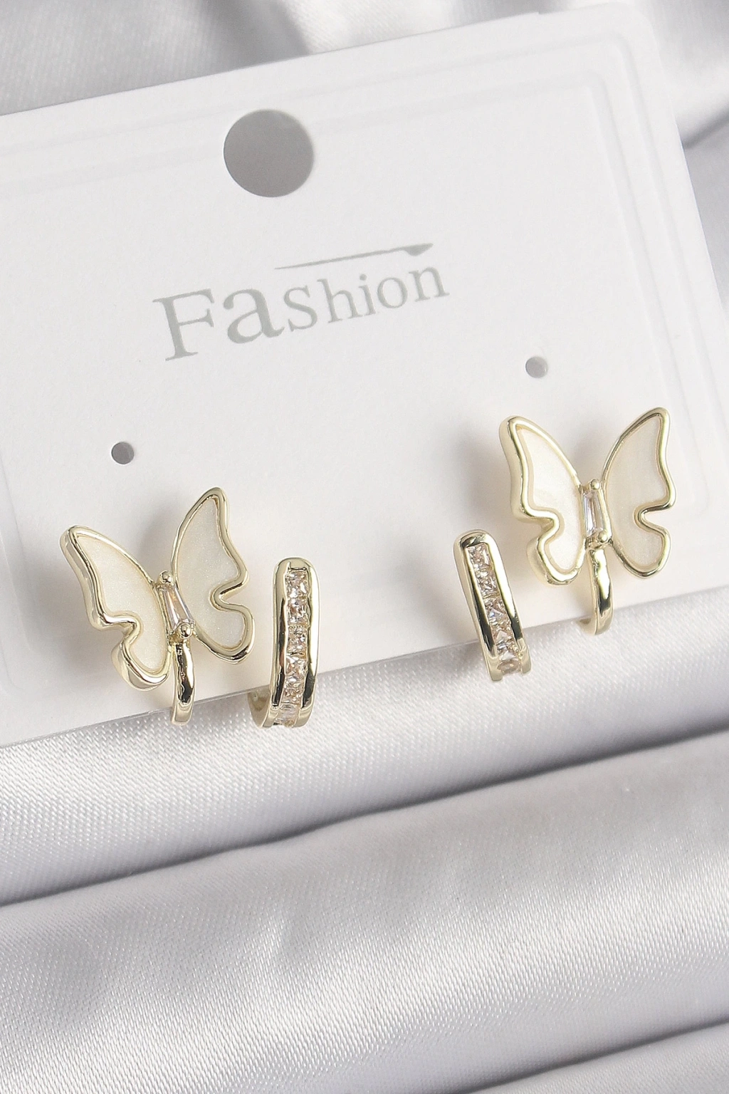 BFS Pirinç Gümüş Renk Zirkon Taş Detaylı Beyaz Sedefli Kelebek Model Kadın Küpe