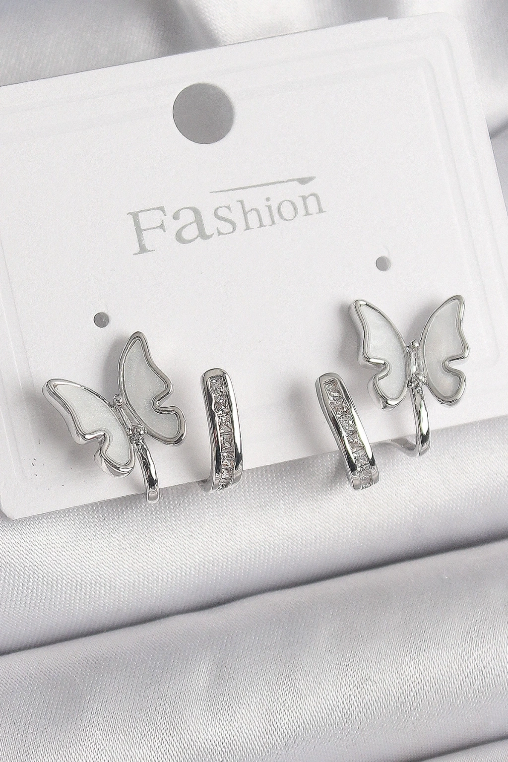 BFS Pirinç Gümüş Renk Zirkon Taş Detaylı Beyaz Sedefli Kelebek Model Kadın Küpe
