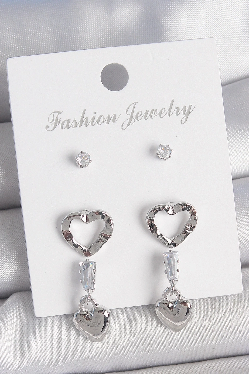 BFS Pirinç Gümüş Renk Zirkon Taş Detaylı Sallantı Model 2 Çift Kadın Küpe Seti