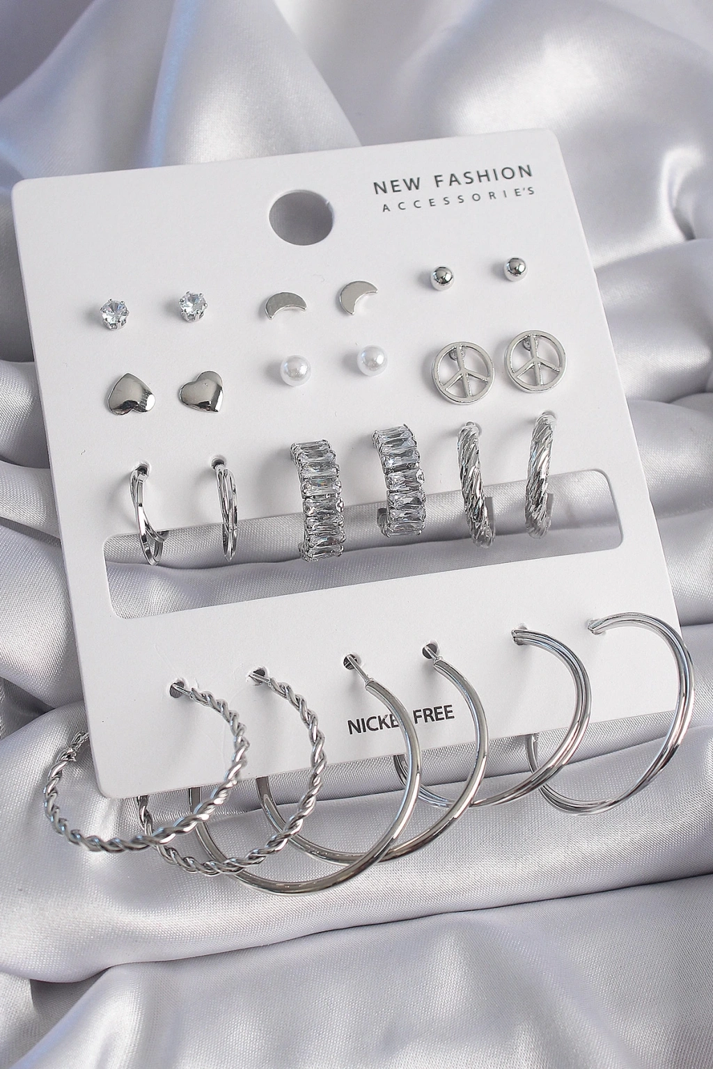 BFS Pirinç Gümüş Renk Zirkon Taşlı 12 Çift Kadın Küpe Seti