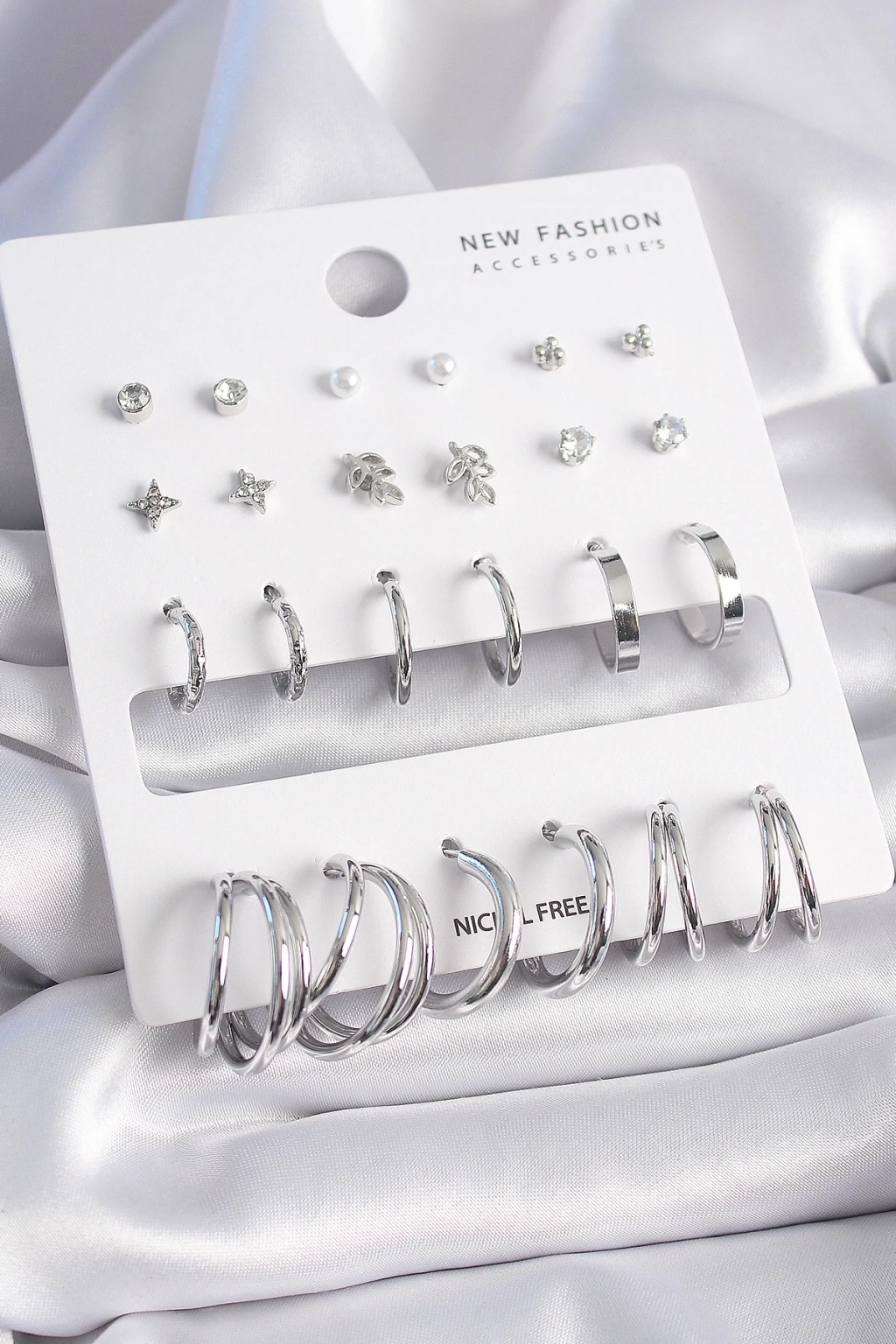BFS Pirinç Gümüş Renk Zirkon Taşlı 12 Çift Küpe Seti