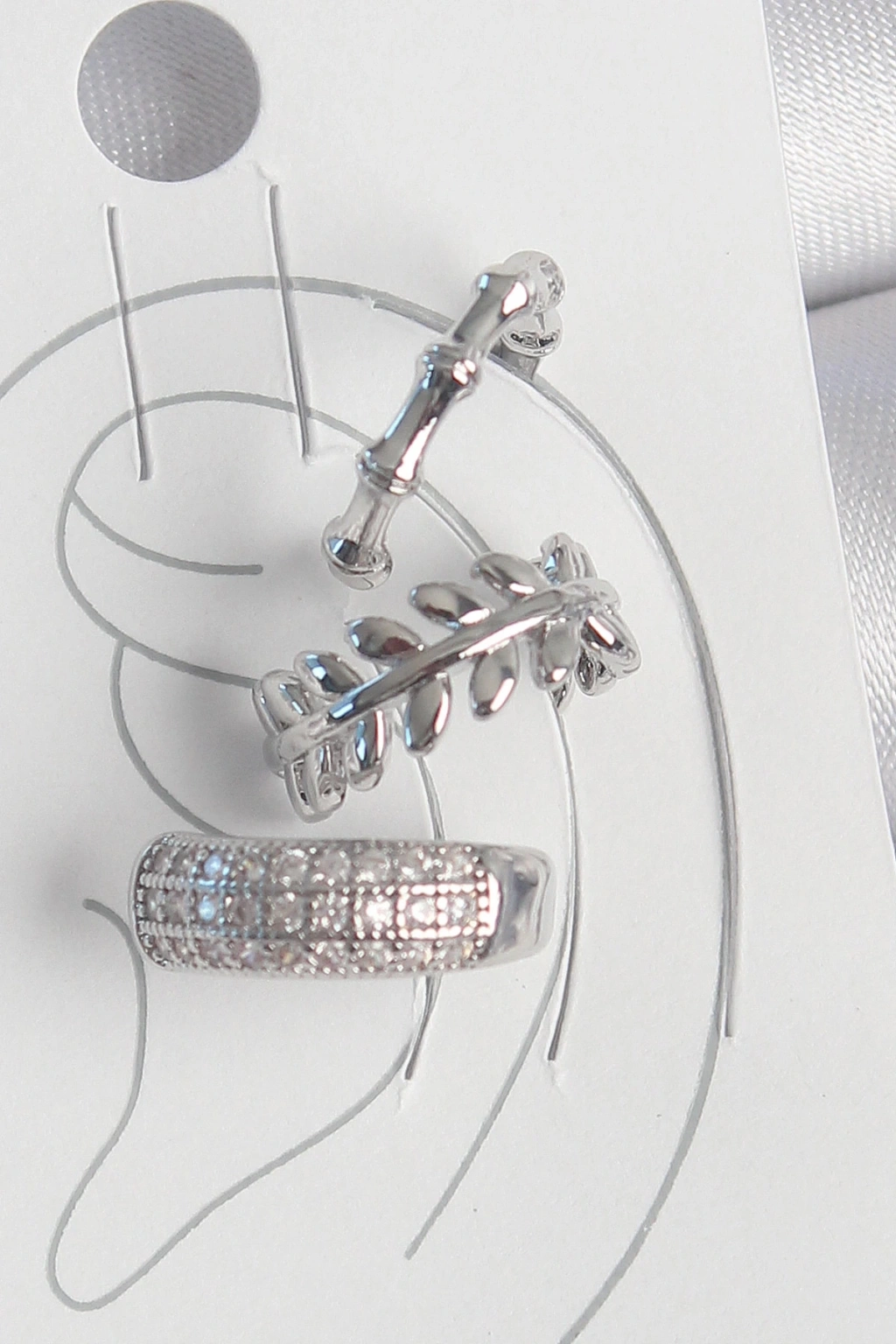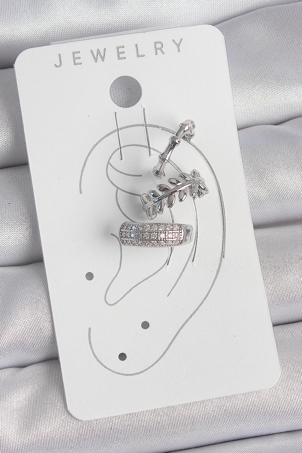 BFS Pirinç Gümüş Renk Zirkon Taşlı 3'Lü Model Yaprak Figür Kadın Kıkırdak Küpe