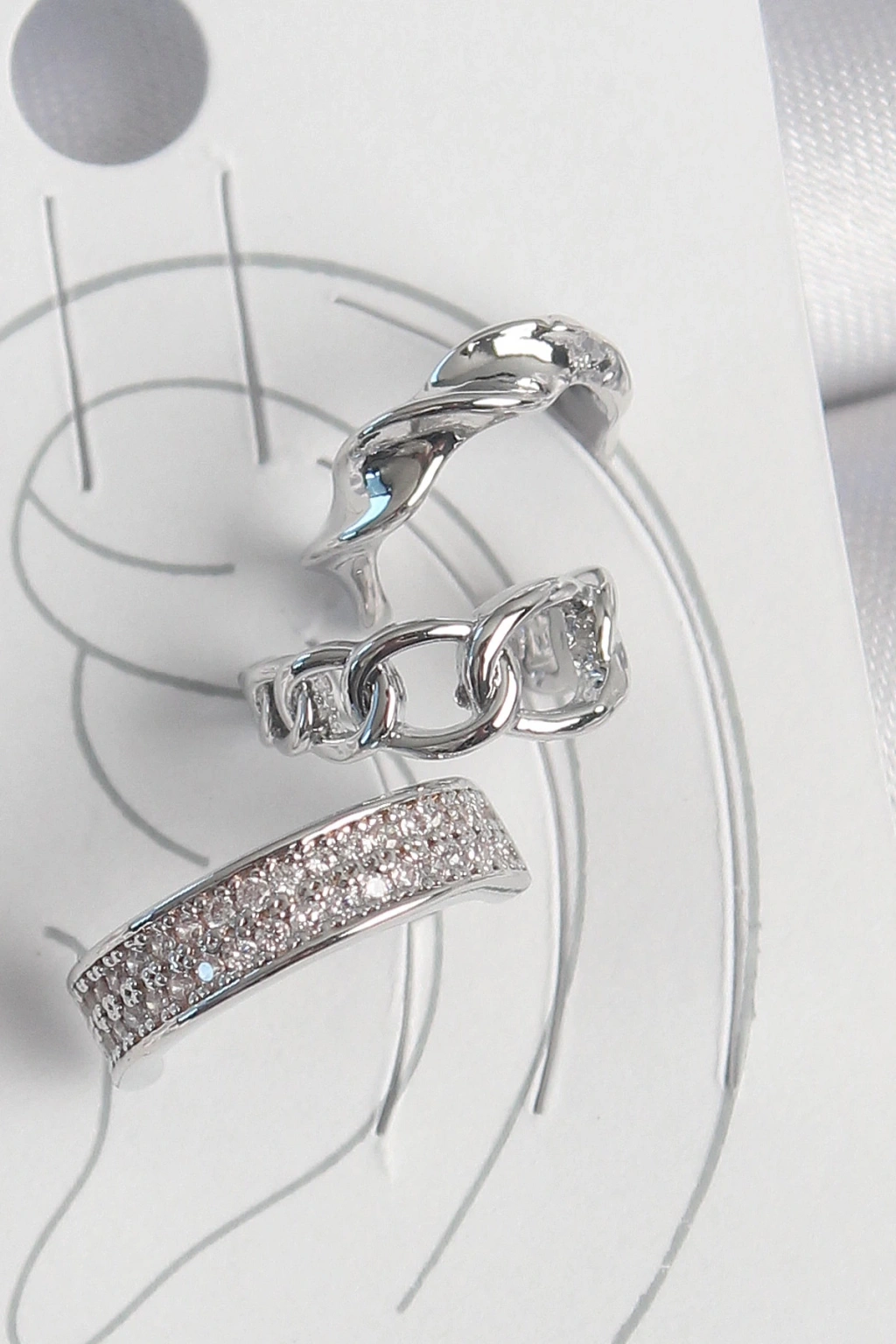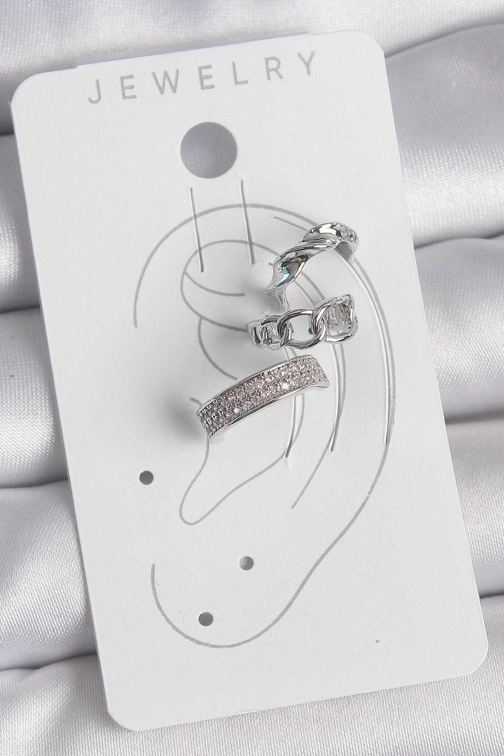 BFS Pirinç Gümüş Renk Zirkon Taşlı 3'Lü Zincir Sarmal Model Kadın Kıkırdak Küpe