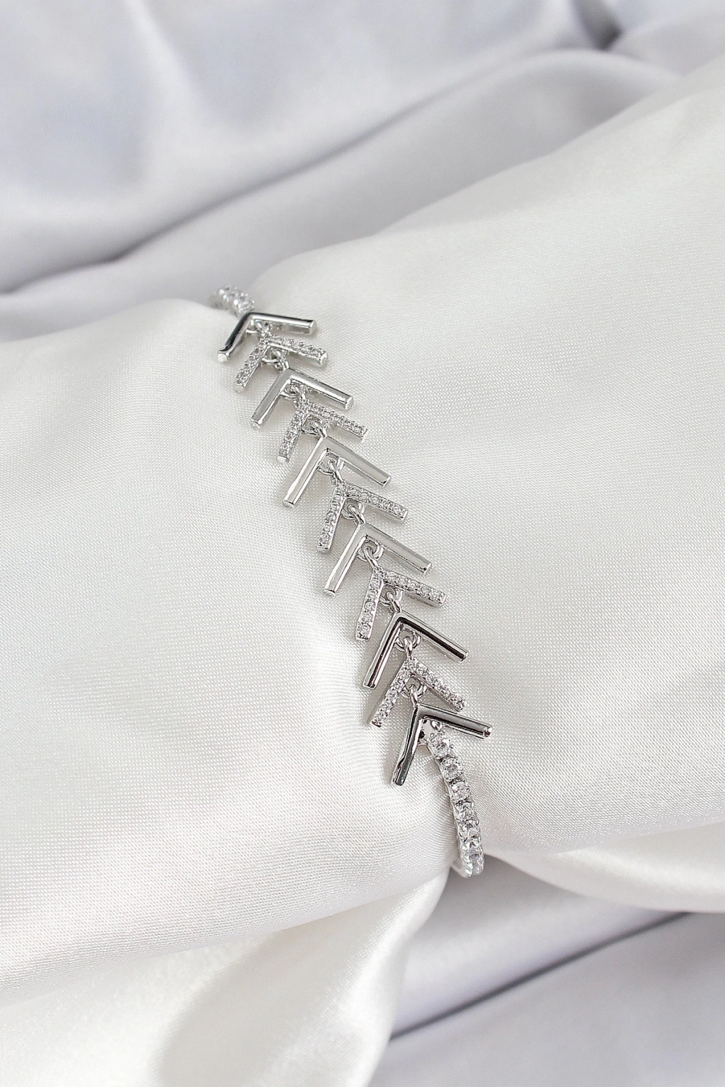 BFS Pirinç Gümüş Renk Zirkon Taşlı Balık Sırtı Kadın Bileklik
