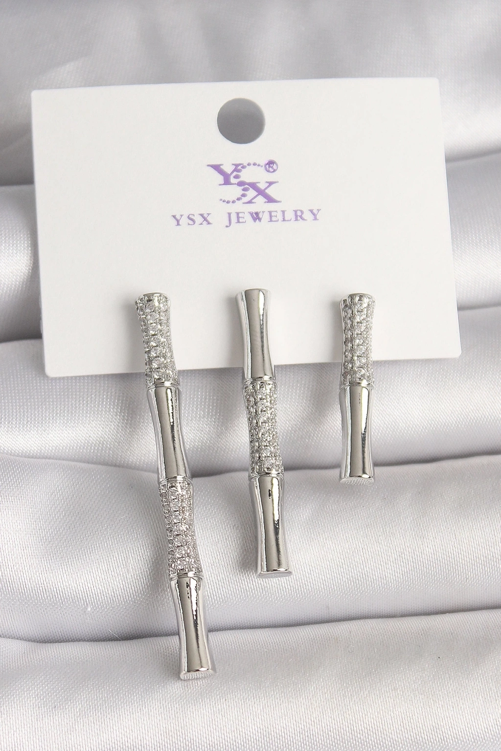 BFS Pirinç Gümüş Renk Zirkon Taşlı Bambu Model 3'Lü Kadın Kombin Küpe