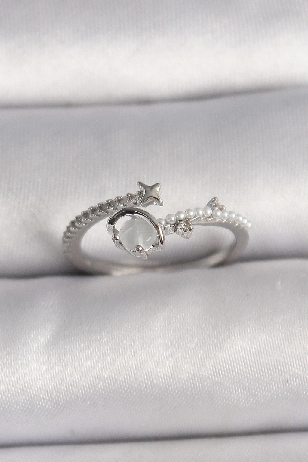 BFS Pirinç Gümüş Renk Zirkon Taşlı Beyaz Mineli Yıldız Detay Ayarlanabilir Kadın Yüzük