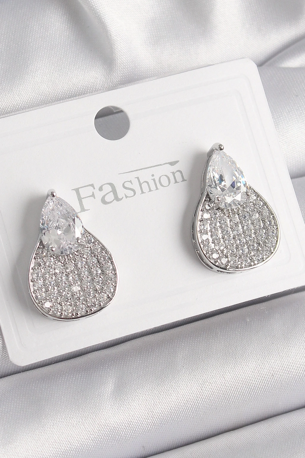 BFS Pirinç Gümüş Renk Zirkon Taşlı Damla Model Kadın Küpe