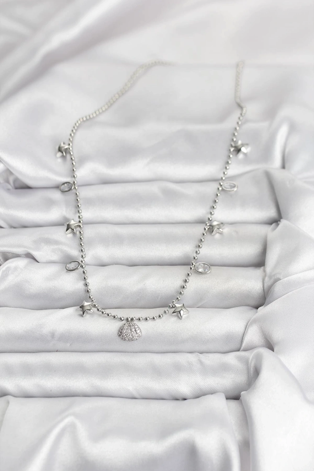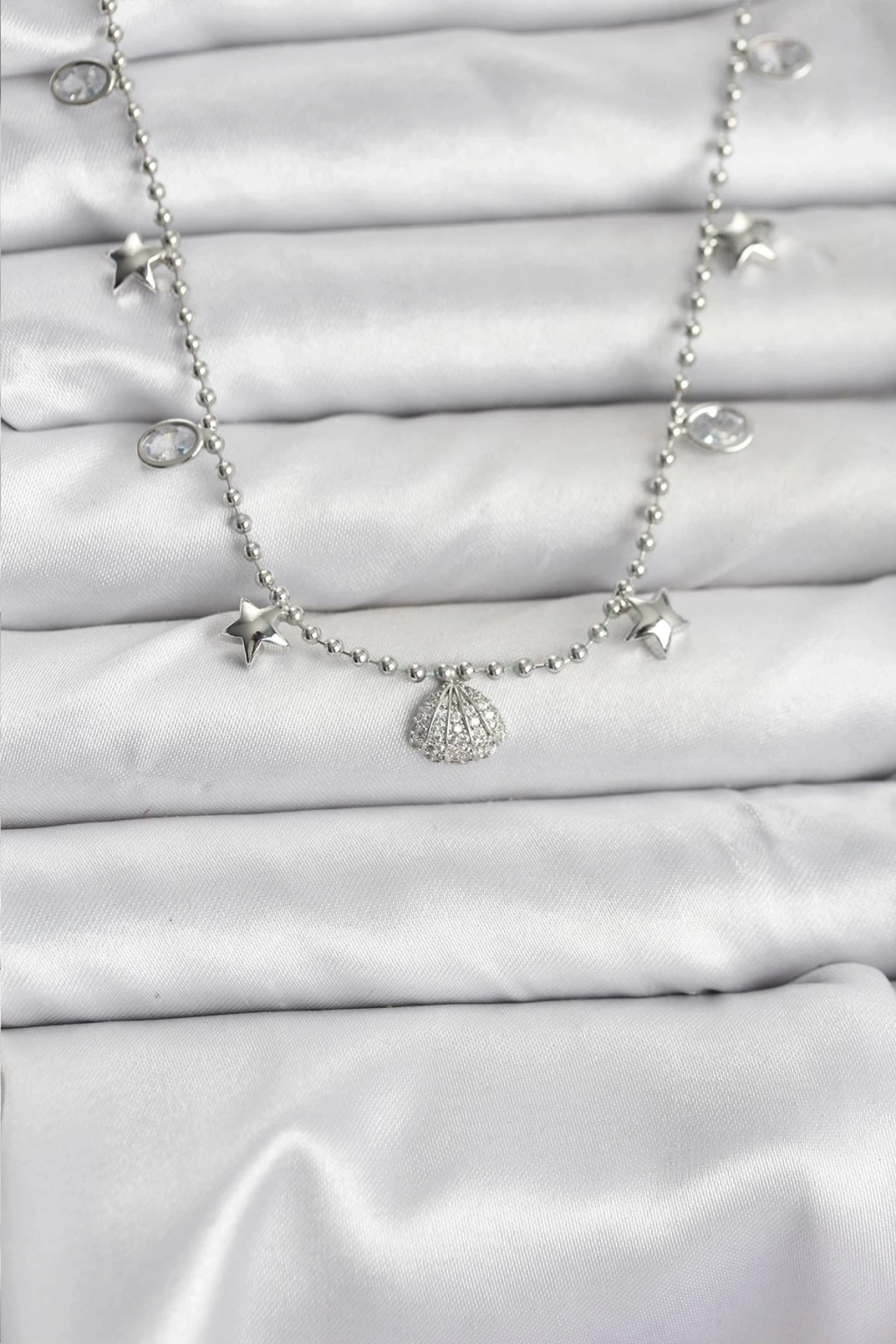BFS Pirinç Gümüş Renk Zirkon Taşlı Deniz Kabuğu Model Kadın Kolye