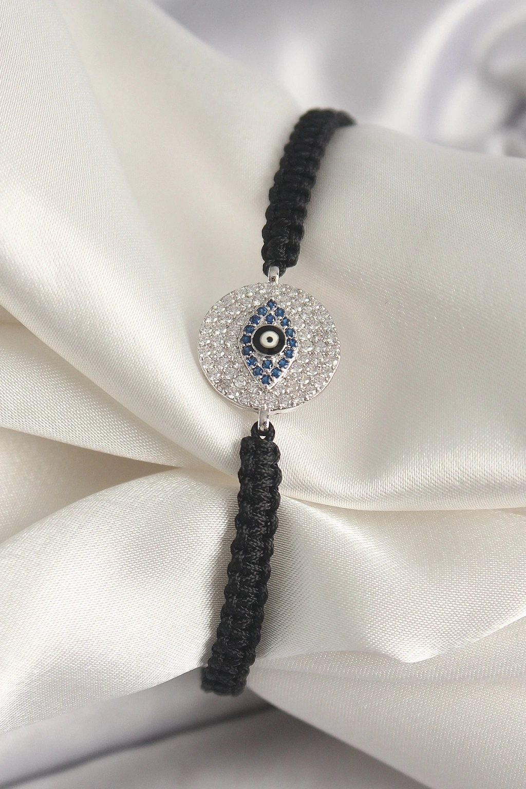 BFS Pirinç Gümüş Renk Zirkon Taşlı Göz İşlemeli Figür Asansörlü Makrome Model Kadın Bileklik