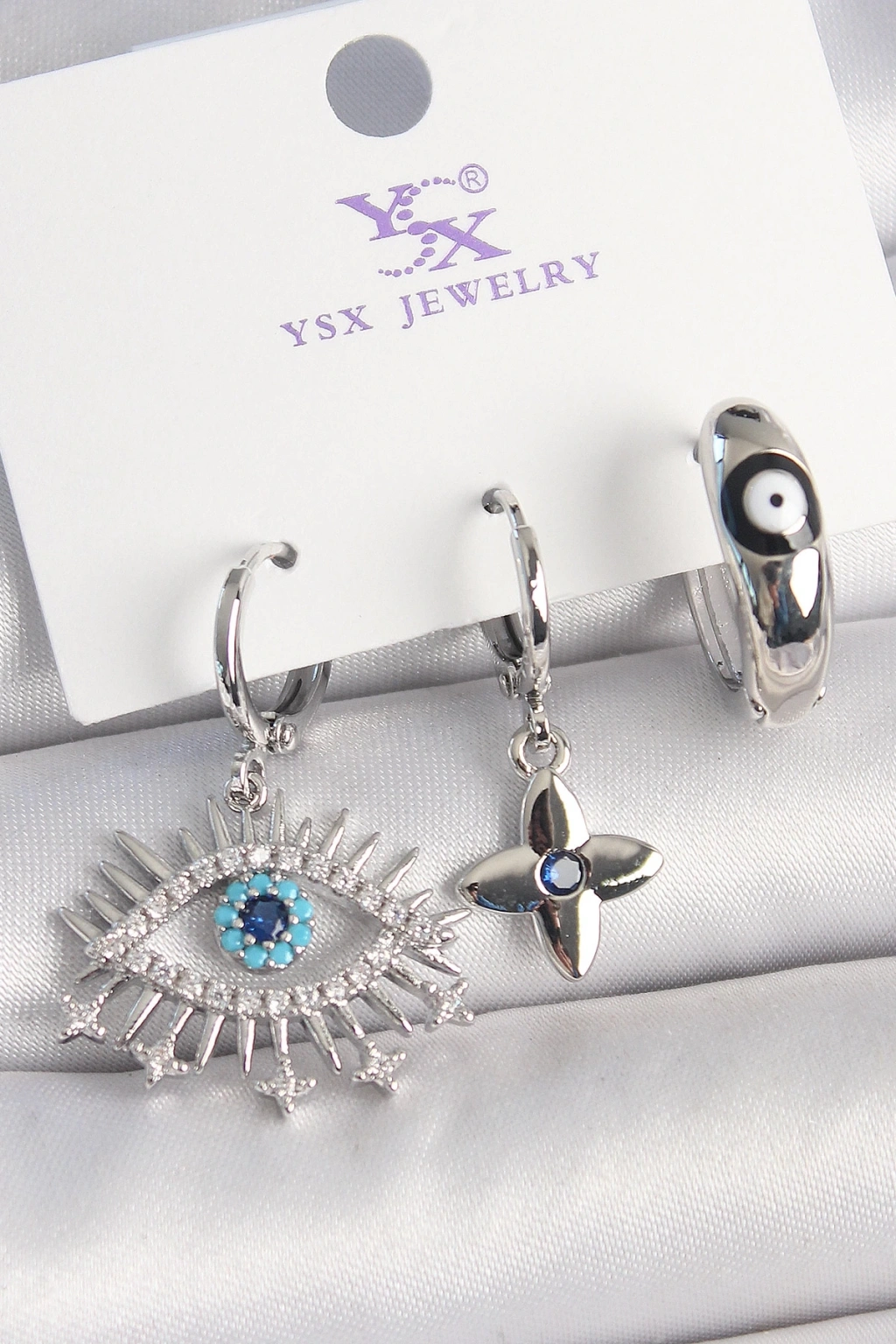 BFS Pirinç Gümüş Renk Zirkon Taşlı Göz Model Nazar Boncuk Detay 3'Lü Kadın Kombin Küpe