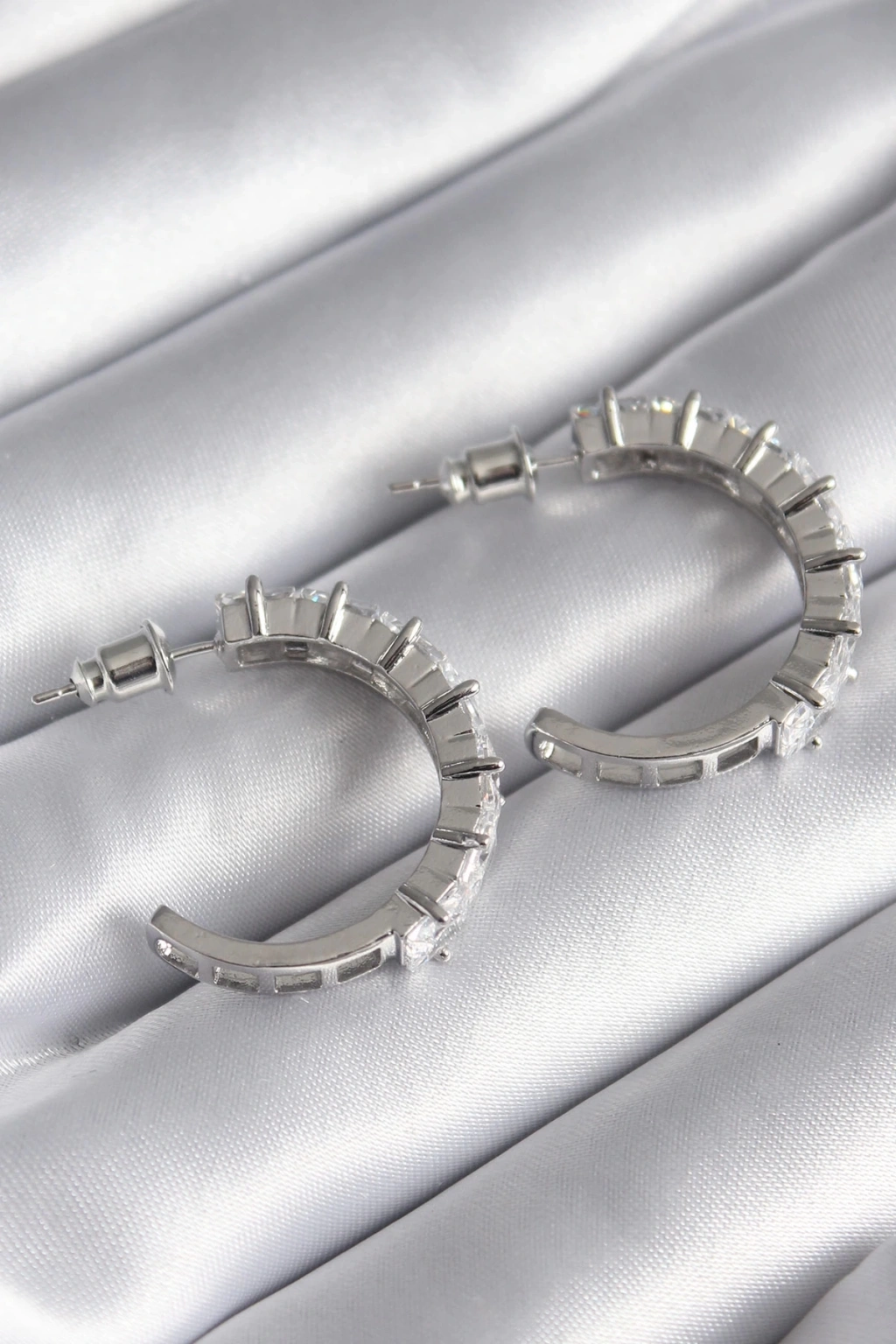 BFS Pirinç Gümüş Renk Zirkon Taşlı Halka Model Kadın Küpe