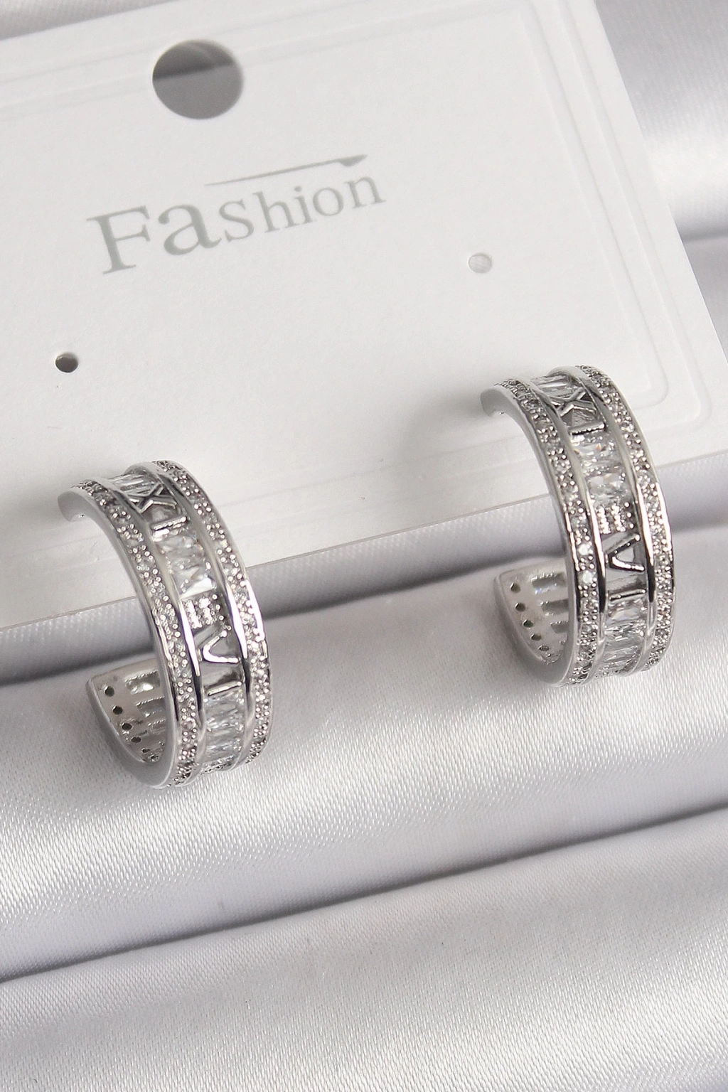 BFS Pirinç Gümüş Renk Zirkon Taşlı İşleme Detay Halka Model Kadın Küpe