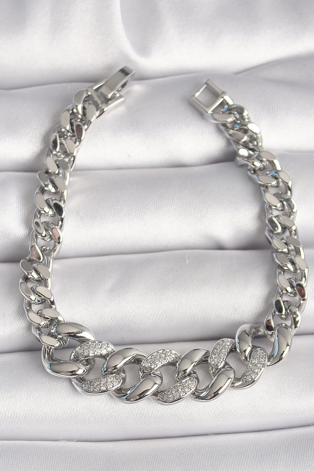 BFS Pirinç Gümüş Renk Zirkon Taşlı Kalın Halka Model Kadın Bileklik