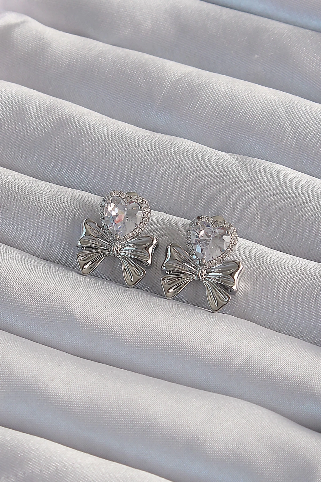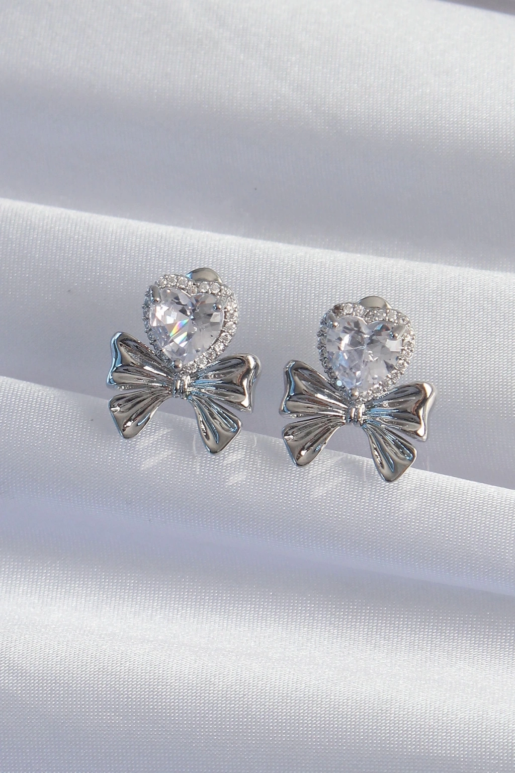 BFS Pirinç Gümüş Renk Zirkon Taşlı Kalp Model Fiyonk Küpe