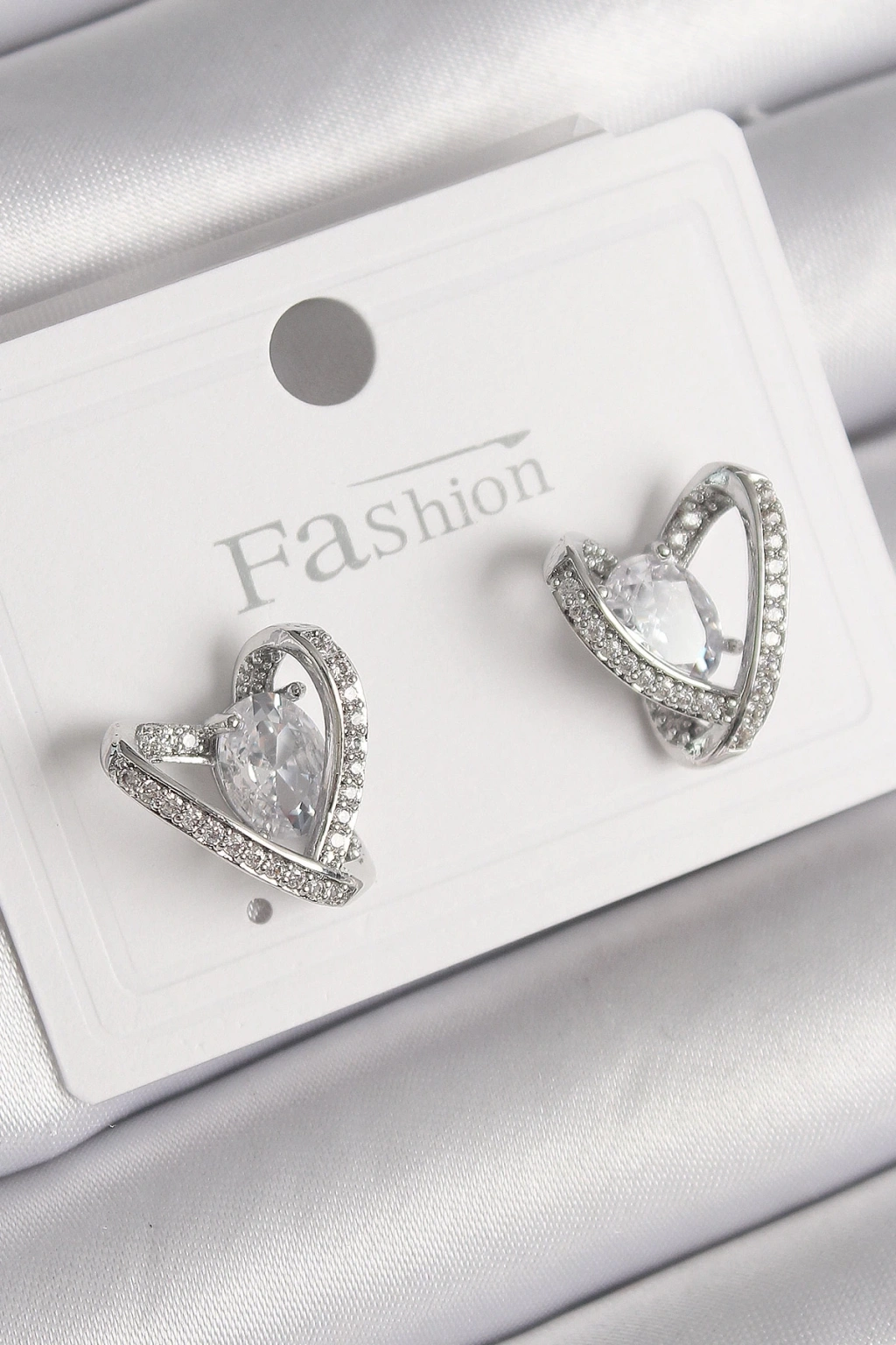 BFS Pirinç Gümüş Renk Zirkon Taşlı Kalp Model Kadın Küpe
