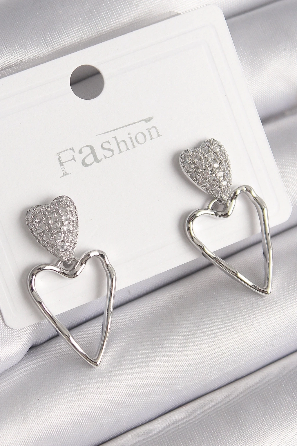 BFS Pirinç Gümüş Renk Zirkon Taşlı Kalp Model Kadın Küpe