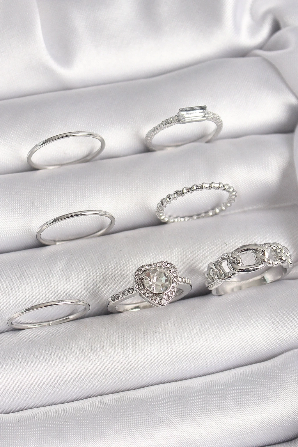 BFS Pirinç Gümüş Renk Zirkon Taşlı Kalp Model Kadın Yüzük Kombini